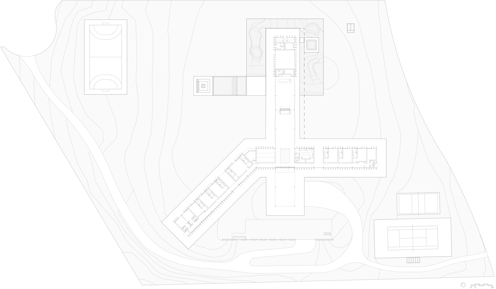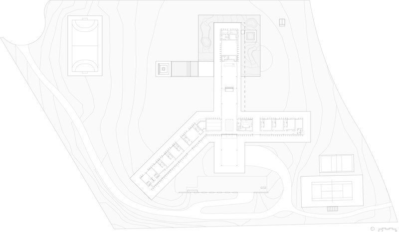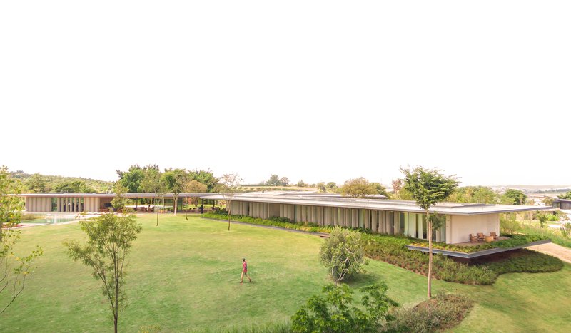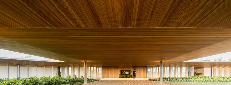 The design is defined by two horizontal planes: a garden slab slightly elevated from the ground and a wide eave with chamfered overhangs. These elements frame programmatic volumes and vertical brise-soleils, creating rhythm and visual continuity.