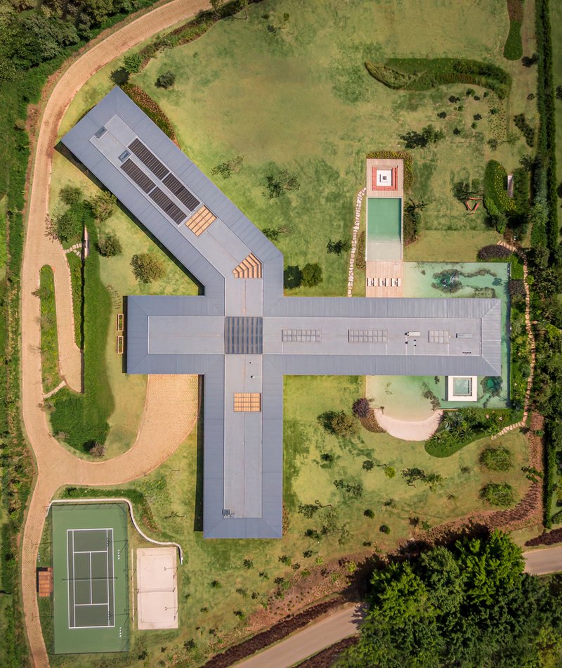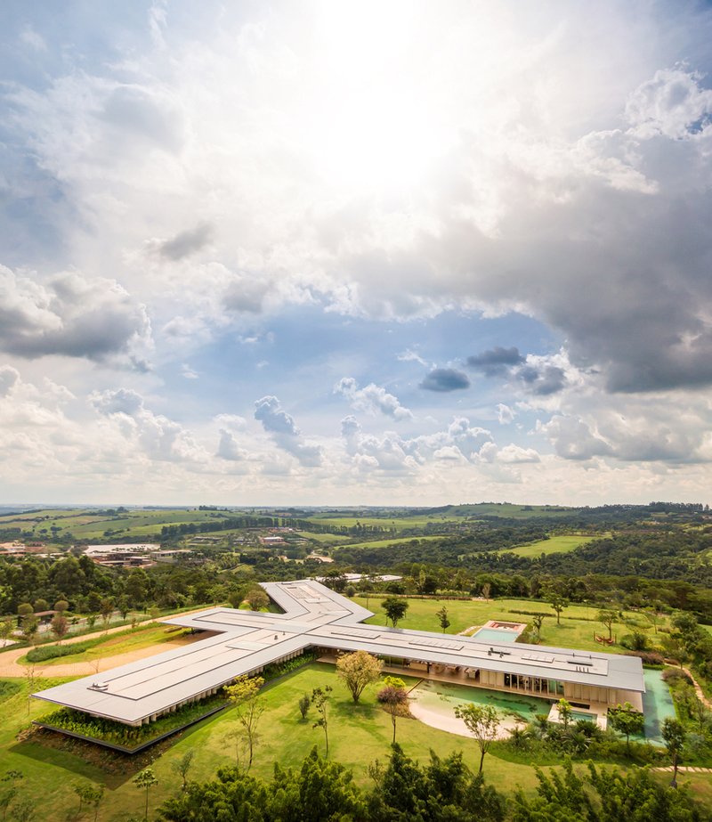 The residence sits atop a sloped plot, strategically placed to preserve the natural topography and maximize views of the surrounding hills and condominium landscape. Jacobsen Arquitetura employs a linear layout, positioning the intimate and social wings along intersecting axes. This arrangement emphasizes the concept of a pavilion house, characterized by open, fluid spaces that integrate with lush gardens.