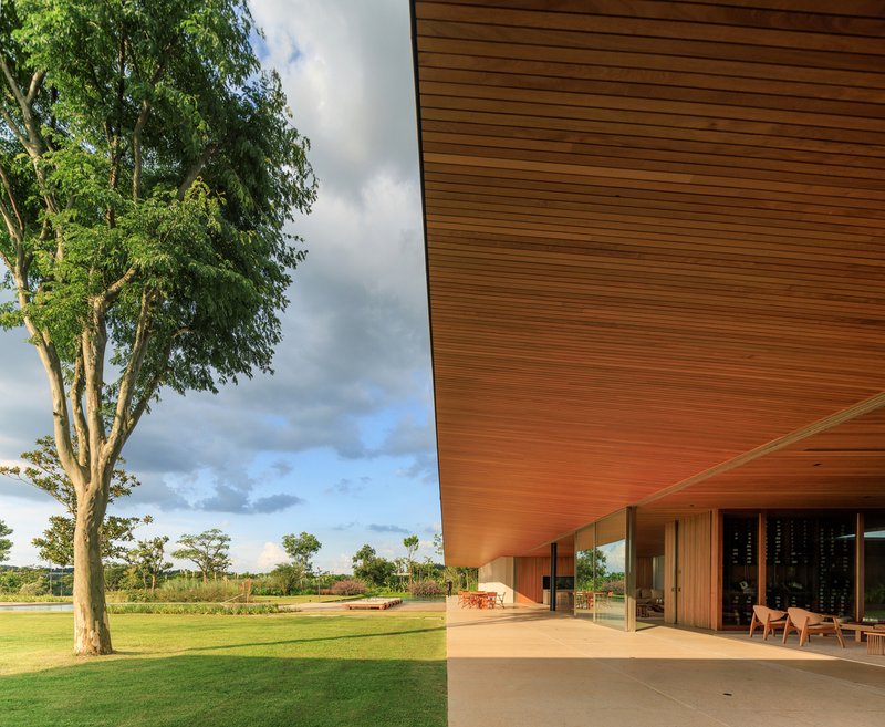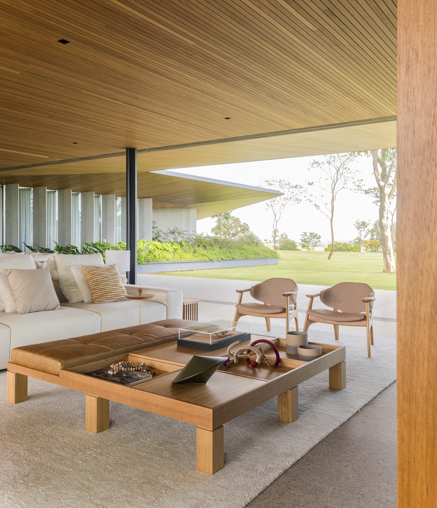 Large glass panels dissolve boundaries between indoors and outdoors, connecting living and dining rooms to shaded balconies under a 4.35-meter overhang. Natural light and cross ventilation enhance the spaces, while wooden furnishings by Brazilian designers reflect the simplicity of a country home.