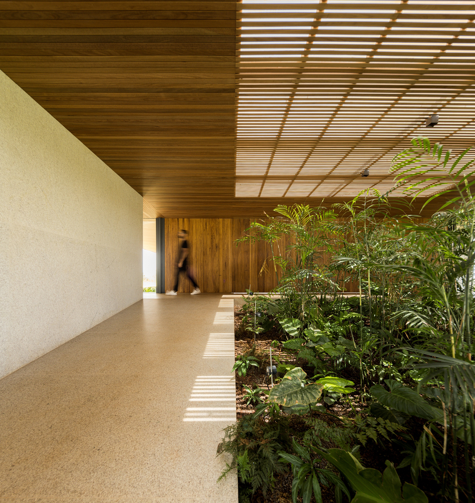 The residence uses natural materials like White Siena granite and Tauari wood, emphasizing comfort and sustainability. Stone brise-soleils and wooden ceilings create a seamless connection between indoor and outdoor spaces.