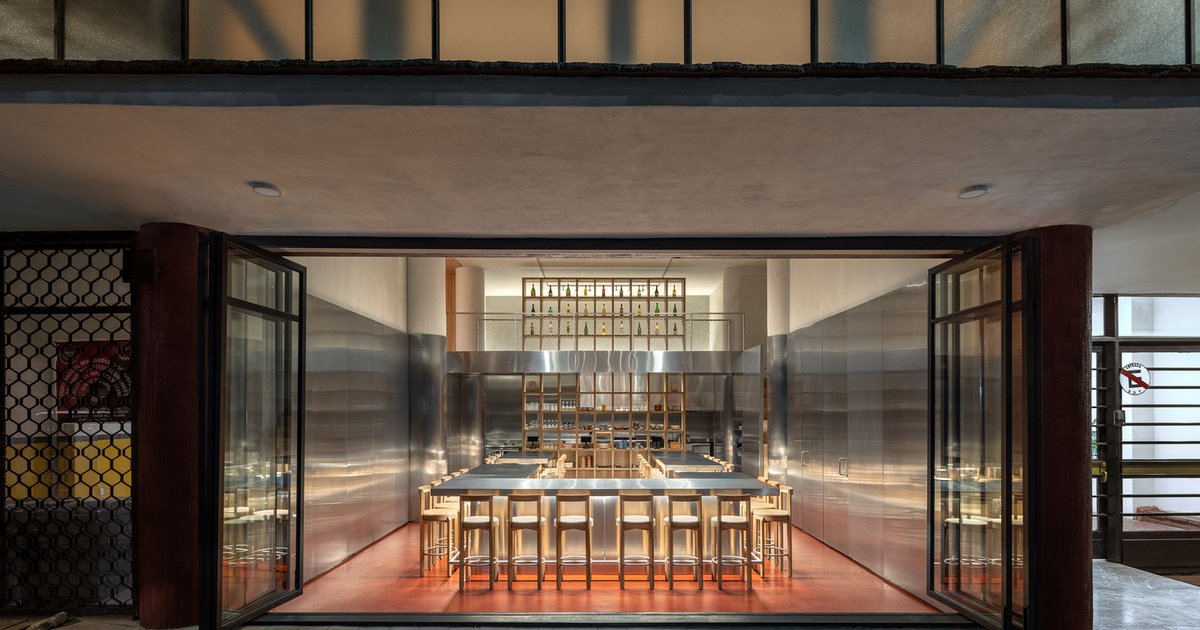 The predominant material used in NINYAS is stainless steel, a deliberate choice to reflect the utilitarian essence of both Mexican and Japanese kitchens. Stainless steel panels, measuring 1 x 3 meters, cover the perimeter walls and form the kitchen furniture and equipment. High, shared dining bars—reminiscent of both sushi counters and Mexican taco stands—dominate the dining space.