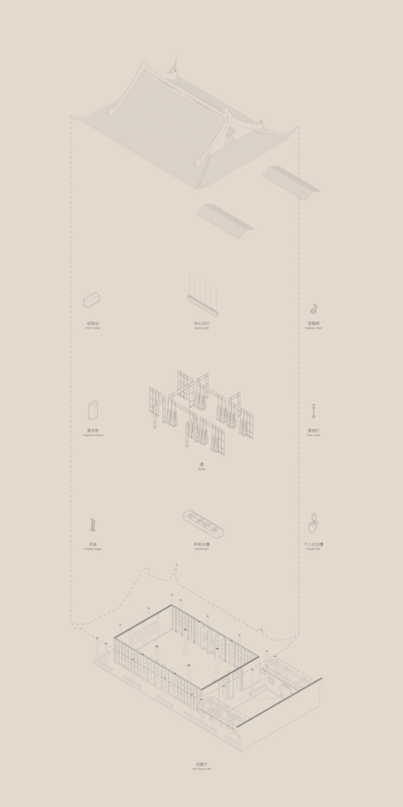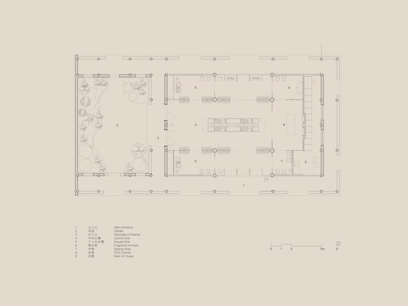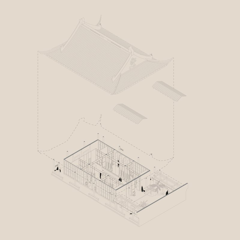 The design concept focuses on integrating modern functionality within the constraints of traditional architecture. Drawing from Jiangnan garden architecture, the space is divided into a central "hall" for communal interaction and surrounding "rooms" for intimate experiences. This layout mirrors traditional spatial divisions while accommodating Aesop’s brand-centric requirements.