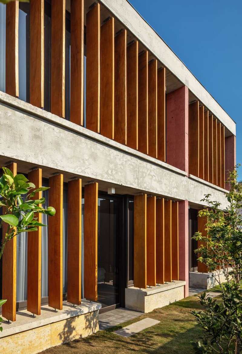 The house employs a material palette that emphasizes warmth and simplicity, using: