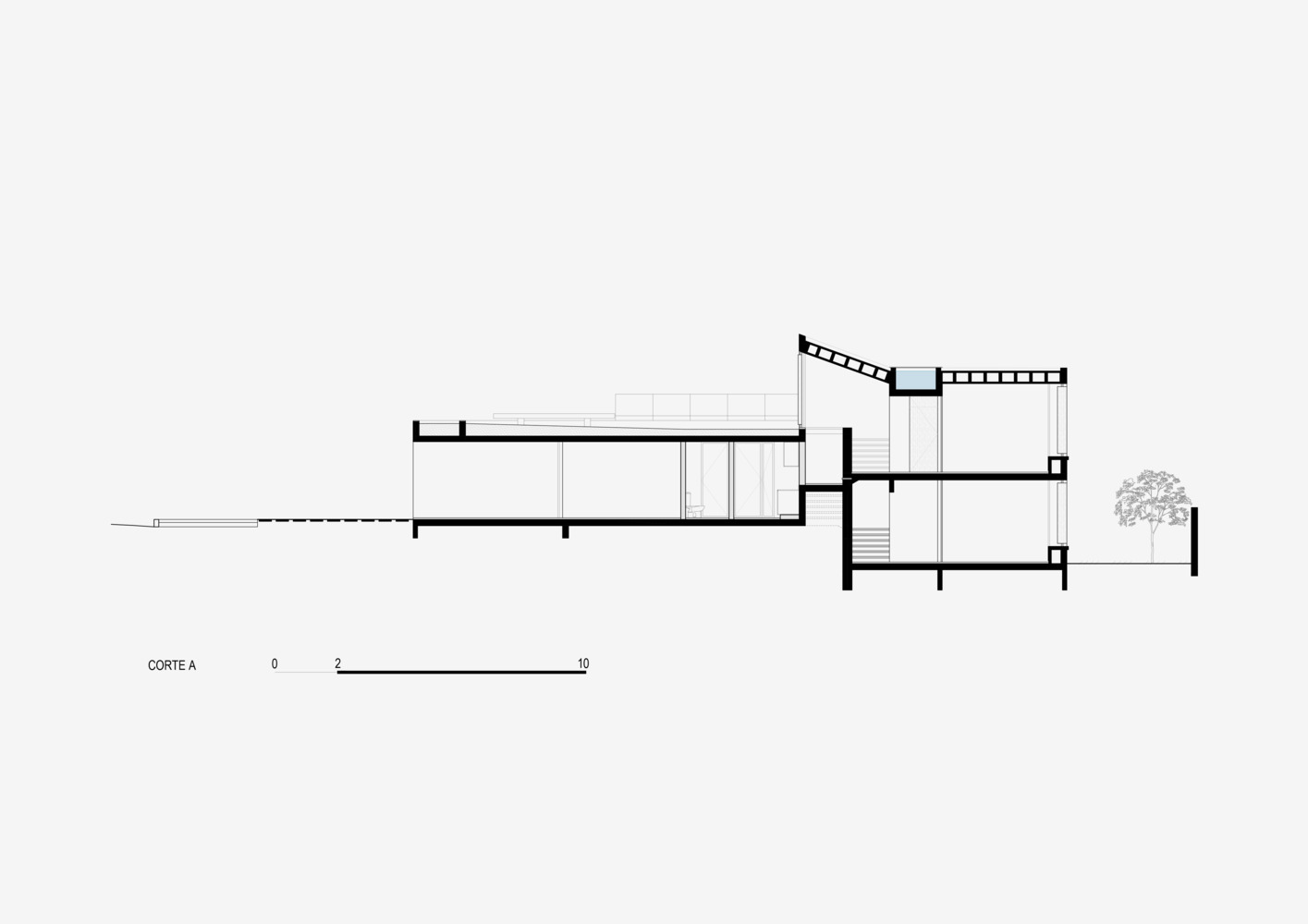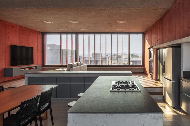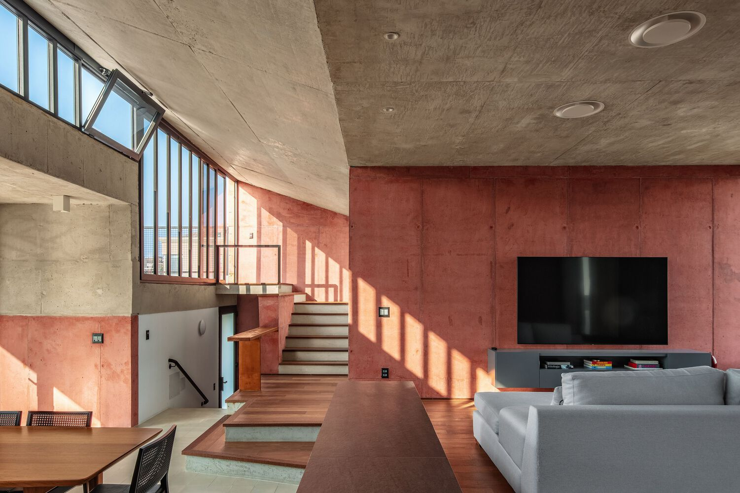 The design includes an intermediate garage floor at street level. Strategic half-level connections between the living areas and bedrooms enhance circulation, resulting in a home that feels open yet distinctly organized.