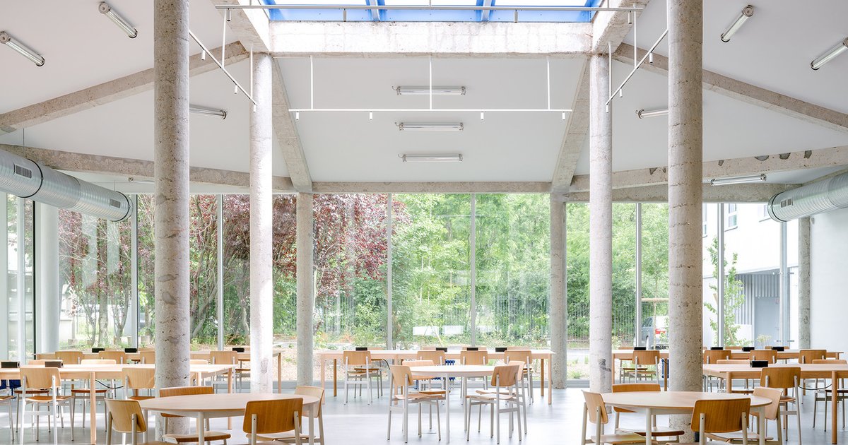 Inside, the design emphasizes brightness and functionality. The concrete structure of the lobby is exposed, and cinder block walls are left bare, creating a palette of greys and textures that highlight the white partitions. Color accents, such as the bright blue repainted staircases, add vibrancy to the interiors. The communal areas feature geometric shapes, including chrome ventilation ducts and elongated white concrete benches, creating a cohesive and modern aesthetic.