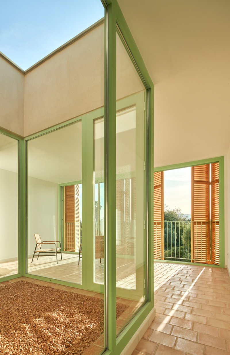 Exterior insulation features sprayed cork and coarse lime, topped with fine lime containing natural pigments, enhancing the building’s thermal efficiency. The roofs are designed with an inverted insulation system, waterproofed and covered with recycled gravel, which supports photovoltaic panels and aerothermal systems, demonstrating an advanced approach to sustainable energy use.