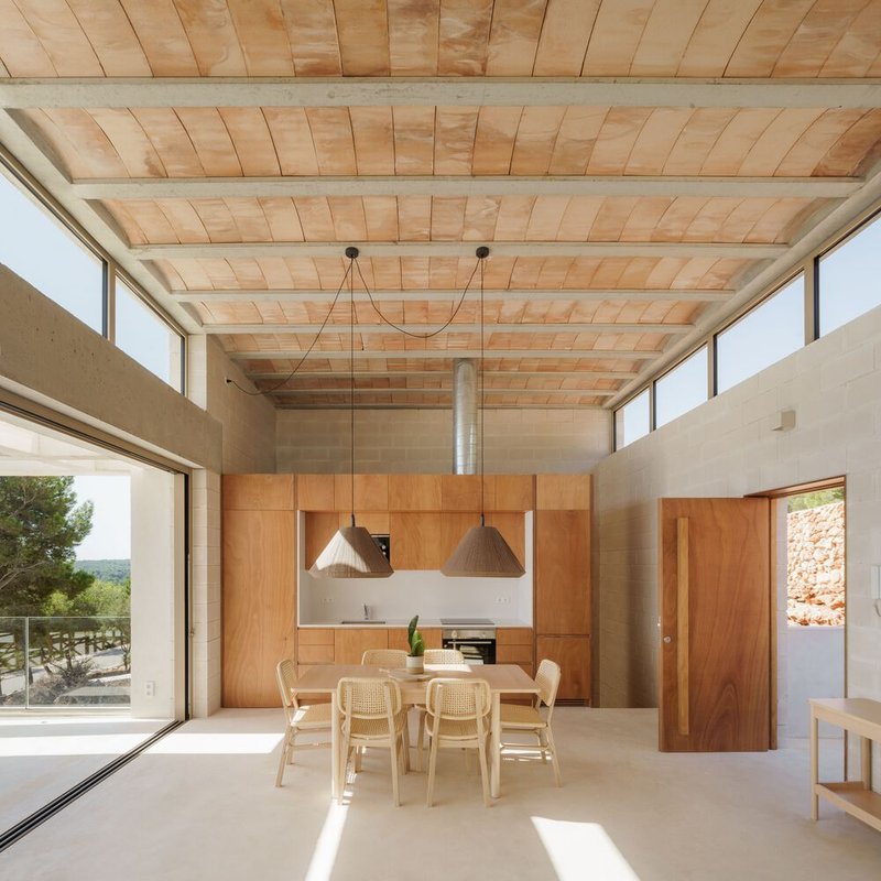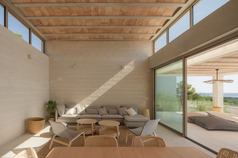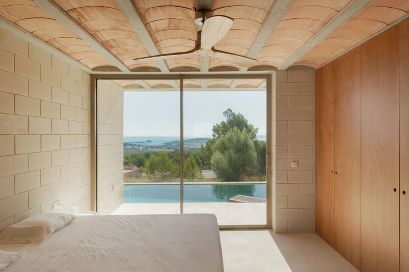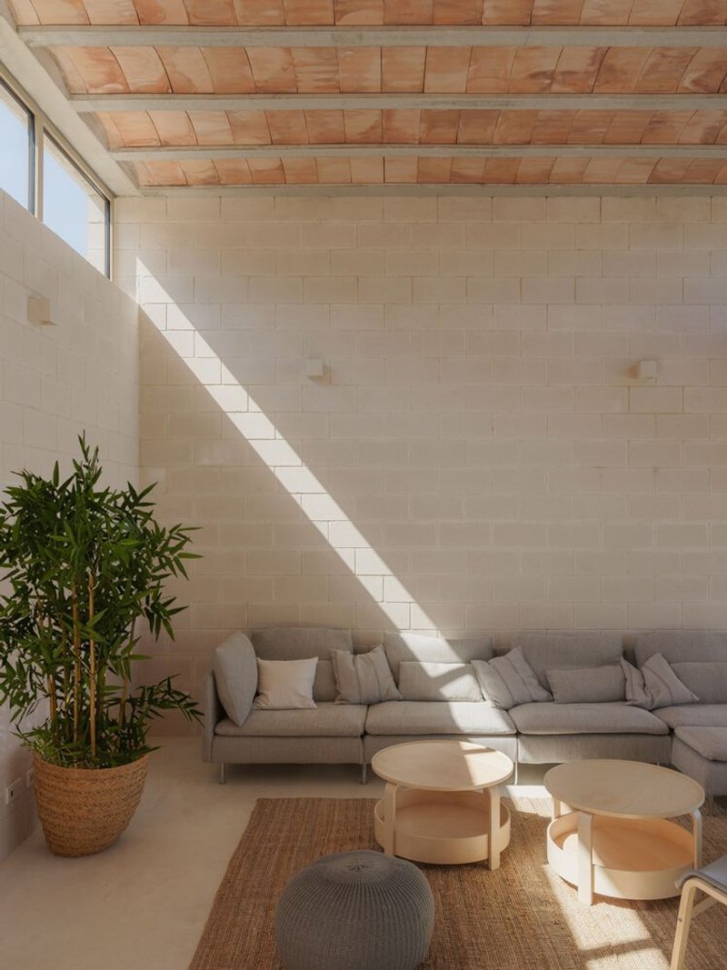 The choice of materials speaks volumes about the commitment to sustainability. Locally sourced limestone, earthenware vaulted ceilings, and sandy-colored masonry and concrete ensure that the house maintains a low environmental impact while echoing the natural palette of its setting. The heavy high thermal inertia materials used in construction are crucial for maintaining stable indoor temperatures, a necessity in the mild-hot climate of the region.