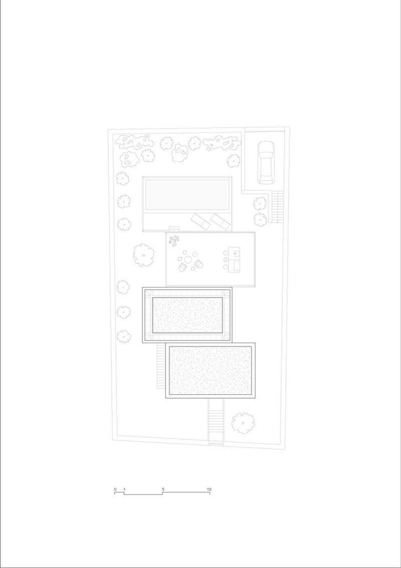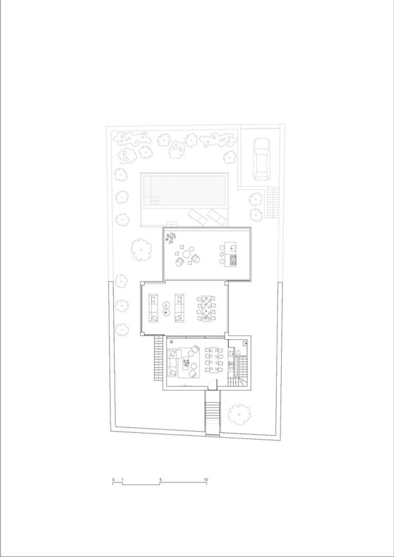 The interior of the Stepped House is a testament to the seamless blend of function and form. A double-height living room acts as the heart of the home, extending into a generous outdoor terrace and a salt-chlorinated pool. The use of large full-height sliding doors and strategic window placements allows for abundant natural light while facilitating natural ventilation, reducing the need for artificial cooling.