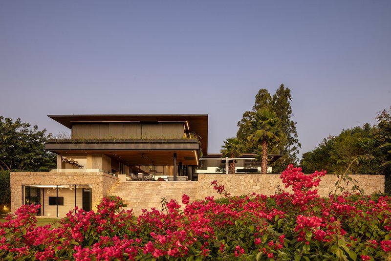 The residence stands out for its volumetric composition, which subtly reveals a split-level design. The upper volume is framed by wide, slender eaves that encircle the entire structure, enhancing both its architectural presence and functional shading. The steel framework allows for expansive, uninterrupted spans, reinforcing the seamless transition between indoor and outdoor spaces. This intelligent use of materials and structure maximizes openness, ensuring a connection with the surrounding landscape while maintaining a sense of privacy and retreat.