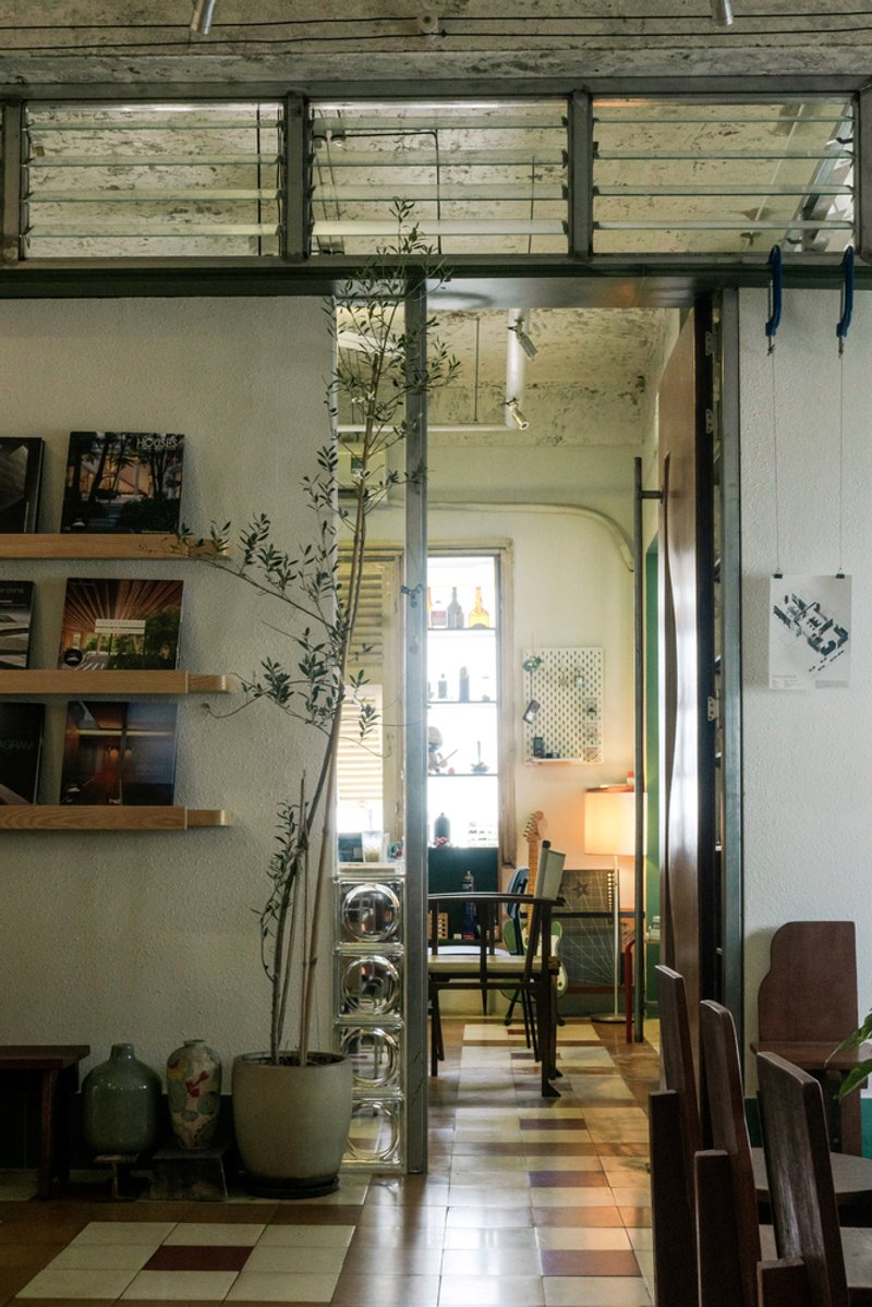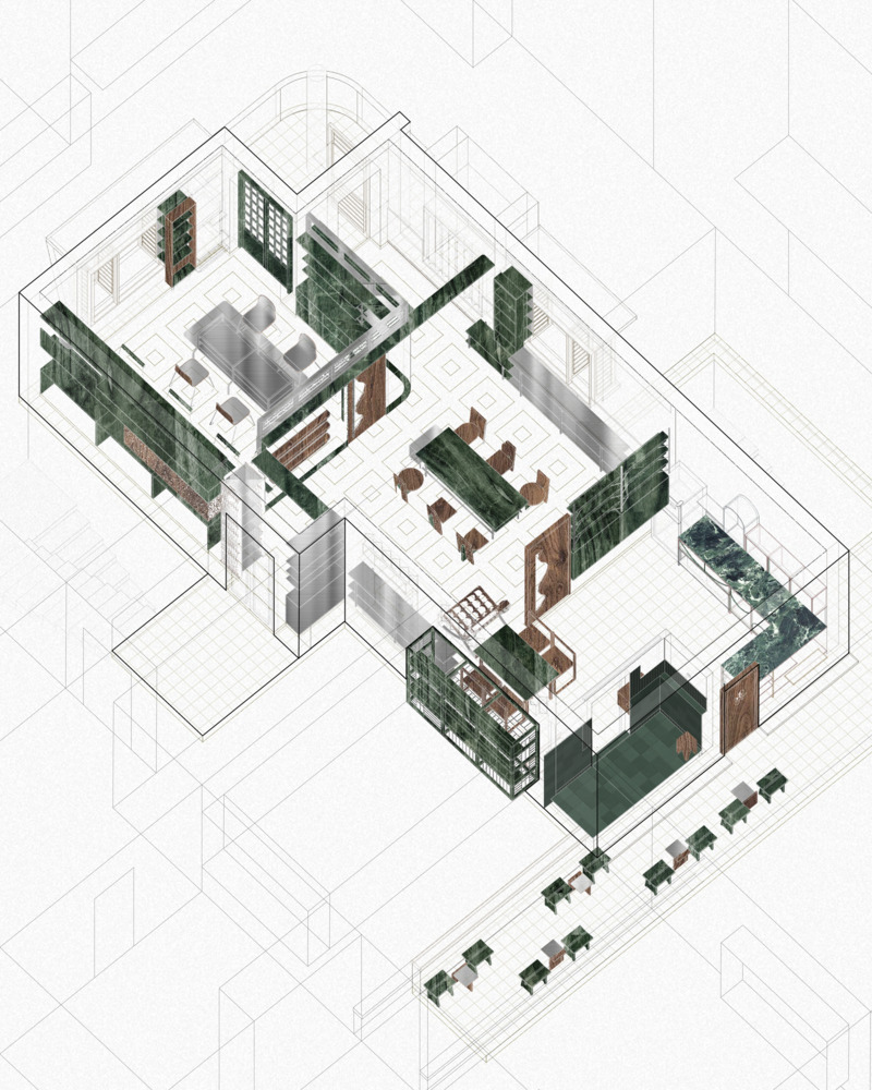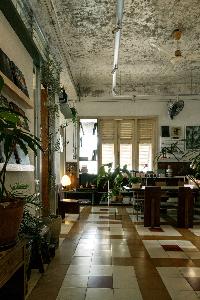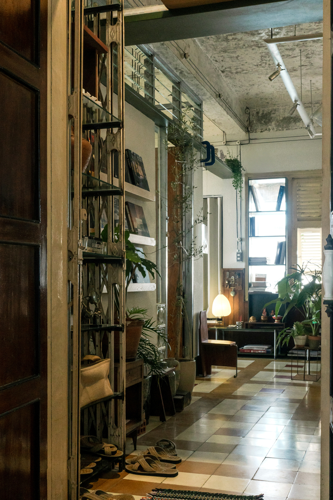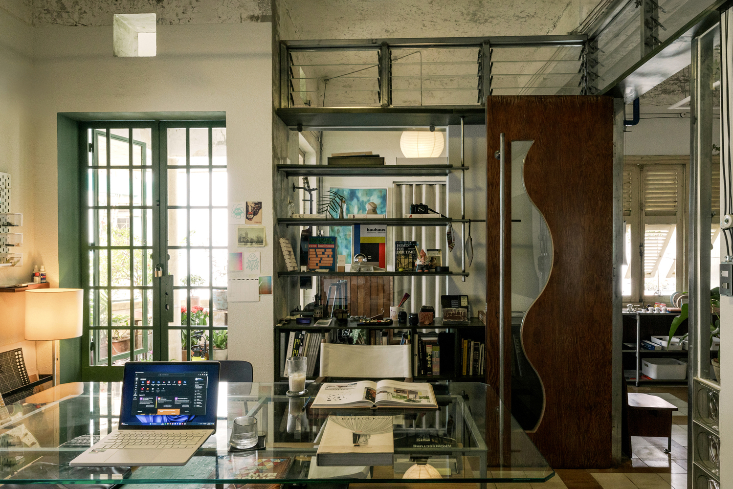 A key aspect of this renovation was the integration of vintage and modern elements. The design team incorporated old furniture pieces, such as cabinet legs and table bases, into the new design. The old door was reimagined with CNC detailing, turning it into a distinctive focal point. Additionally, shutter doors, inspired by modernist tropical architecture, were added to enhance the sense of openness and fluidity within the space. These elements created a harmonious environment where the old and new coexisted in a visually engaging way.