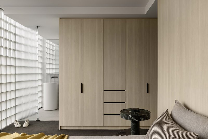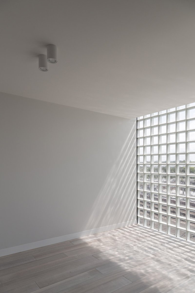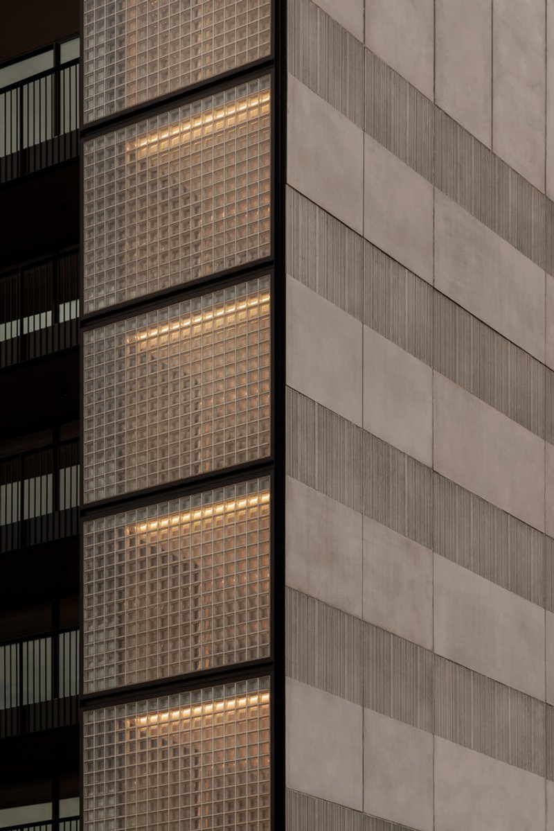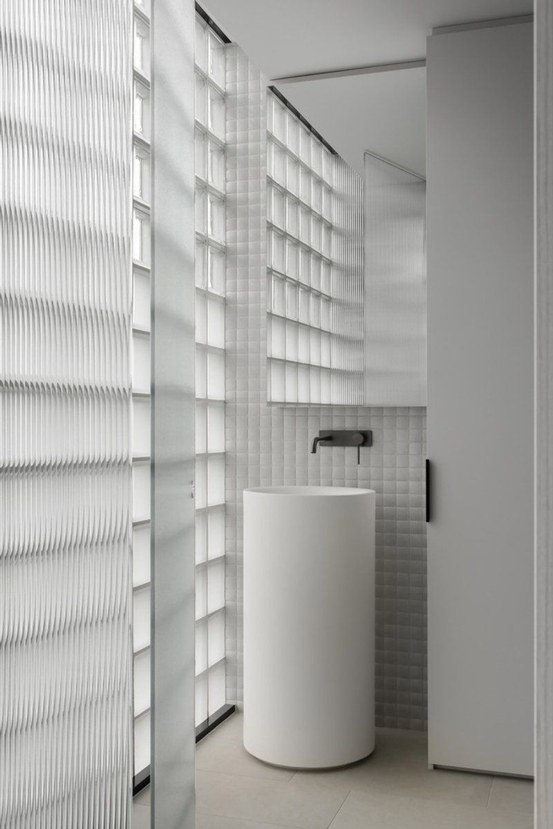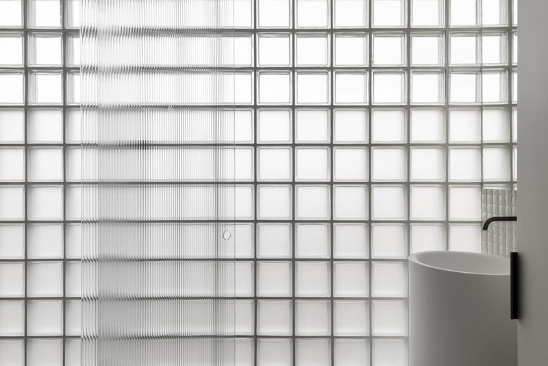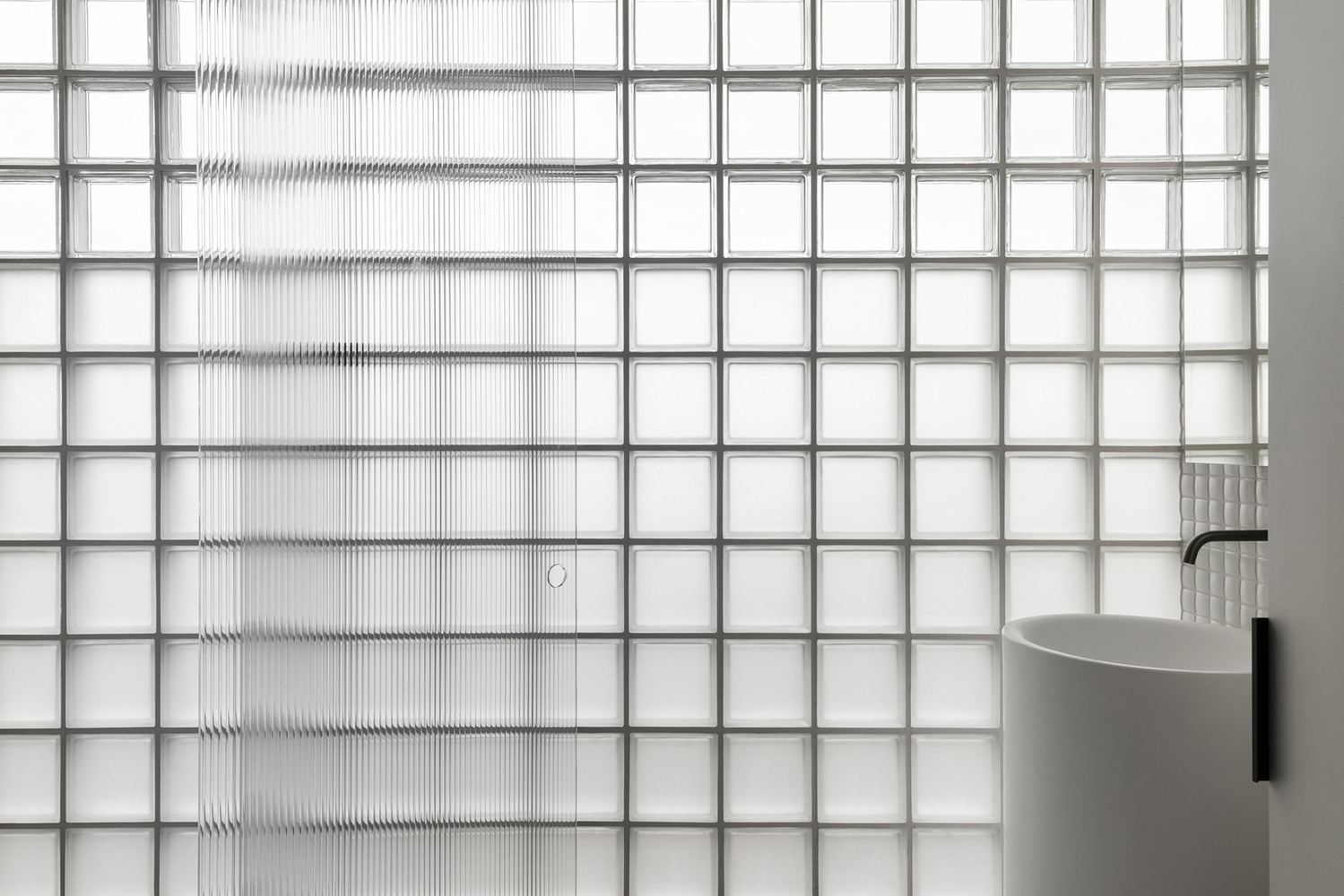 The architectural language prioritizes transparency, reflectivity, and subtle modulation of light. Glass blocks on the north and south façades work in concert with recessed operable glazing to maximize views and ventilation, while also creating ethereal light effects throughout the interior. Inside, the use of textured glass partitions and doors continues this language of permeability, transforming daylight into an atmospheric design element that animates the apartments across the day.