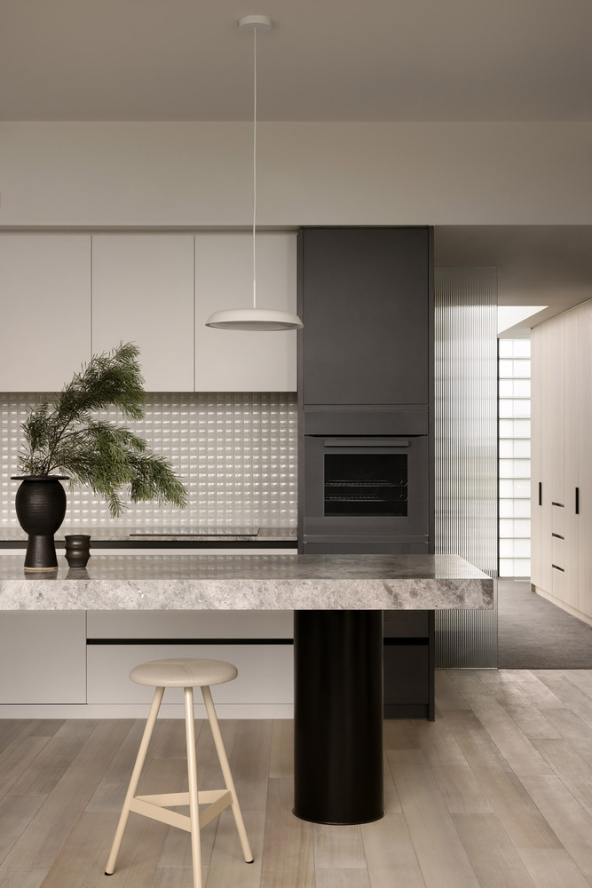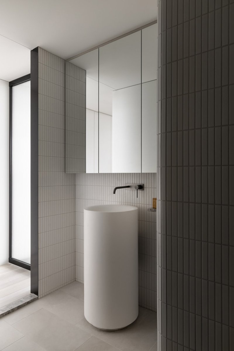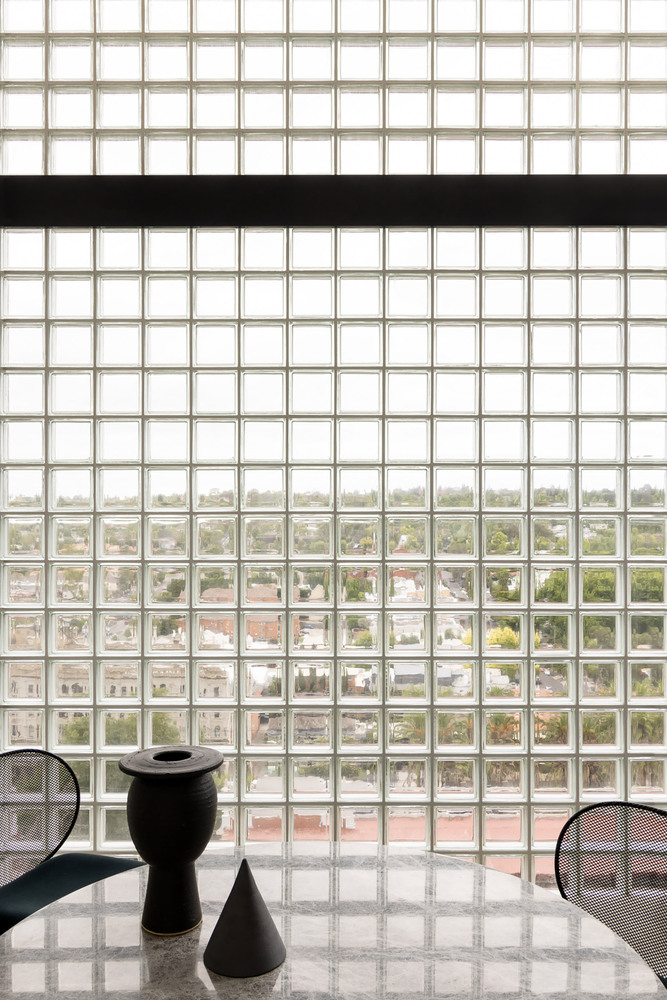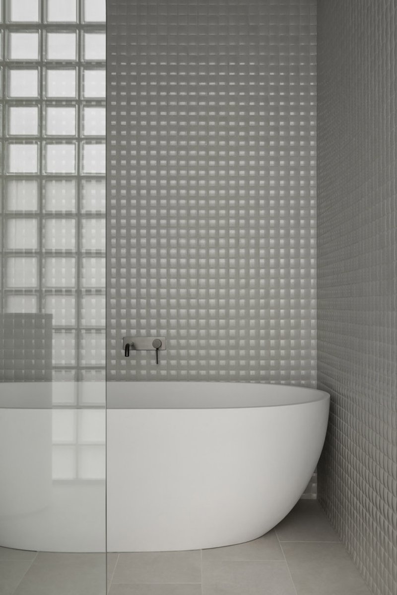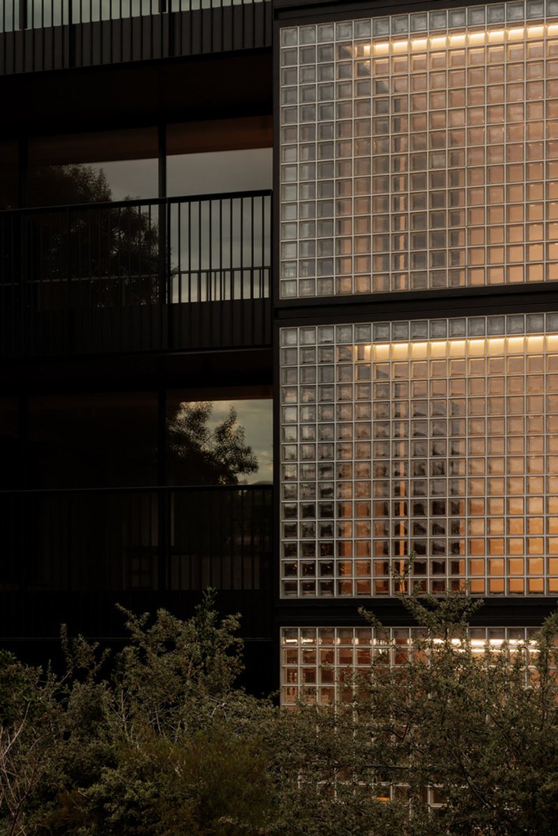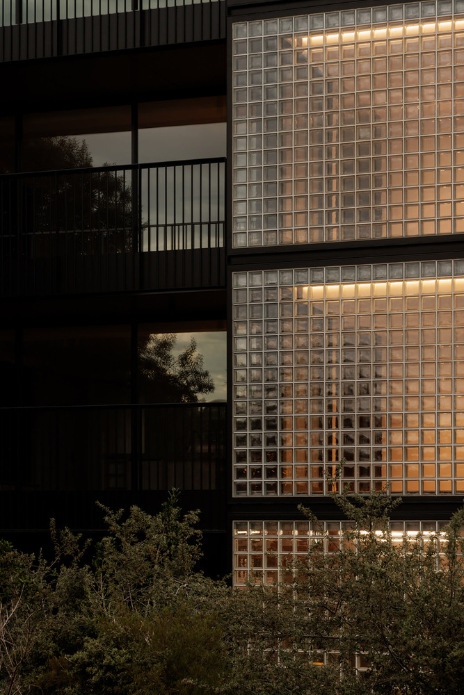 The architectural language prioritizes transparency, reflectivity, and subtle modulation of light. Glass blocks on the north and south façades work in concert with recessed operable glazing to maximize views and ventilation, while also creating ethereal light effects throughout the interior. Inside, the use of textured glass partitions and doors continues this language of permeability, transforming daylight into an atmospheric design element that animates the apartments across the day.