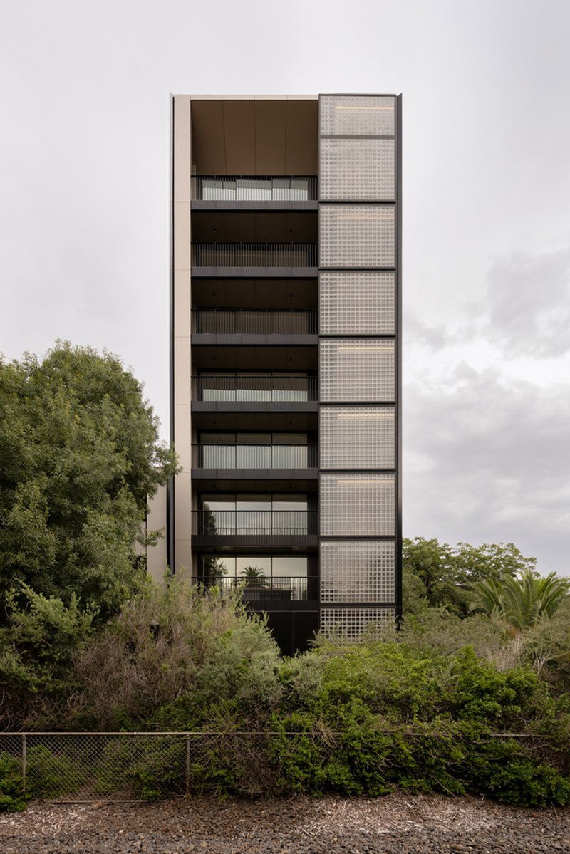Located in Hawthorn, Australia, the Newburgh Light House by Splinter Society is a pioneering model of modular apartment architecture, strategically sited in Auburn Village on an exceptionally tight 150m² plot. Designed to accommodate 21 residents over 10 levels, this vertical housing solution transforms extreme site limitations into a design advantage through prefabrication, translucency, and innovation. With no street frontage and an active railway bordering the north, the building reimagines urban infill typologies through spatial efficiency and luminous design.