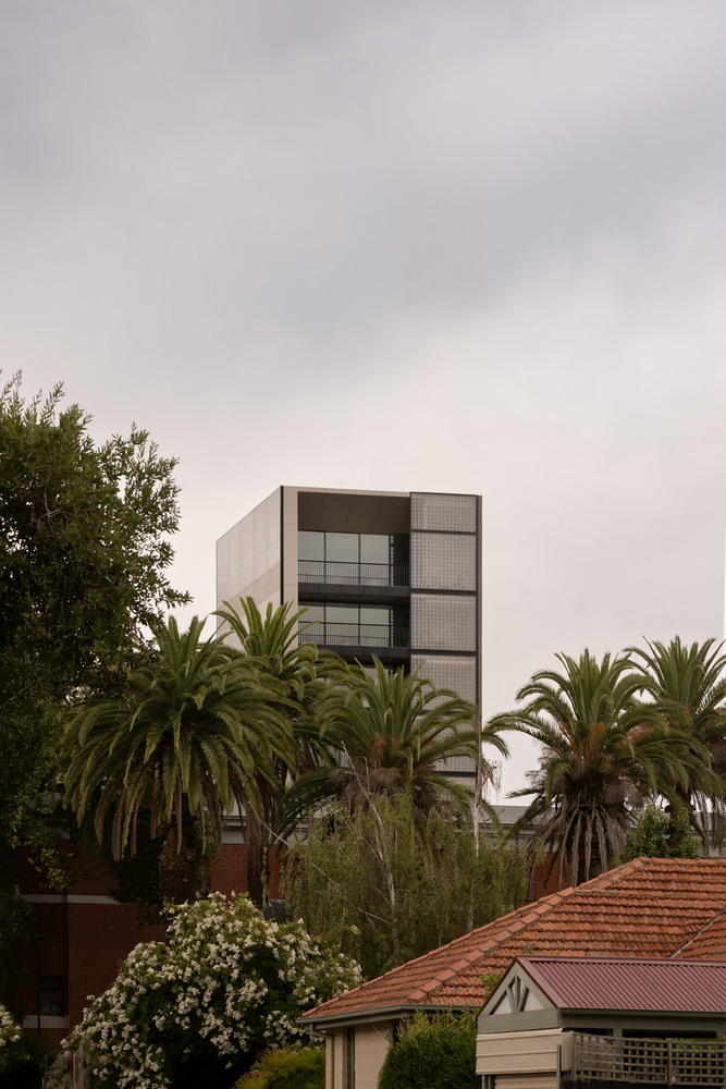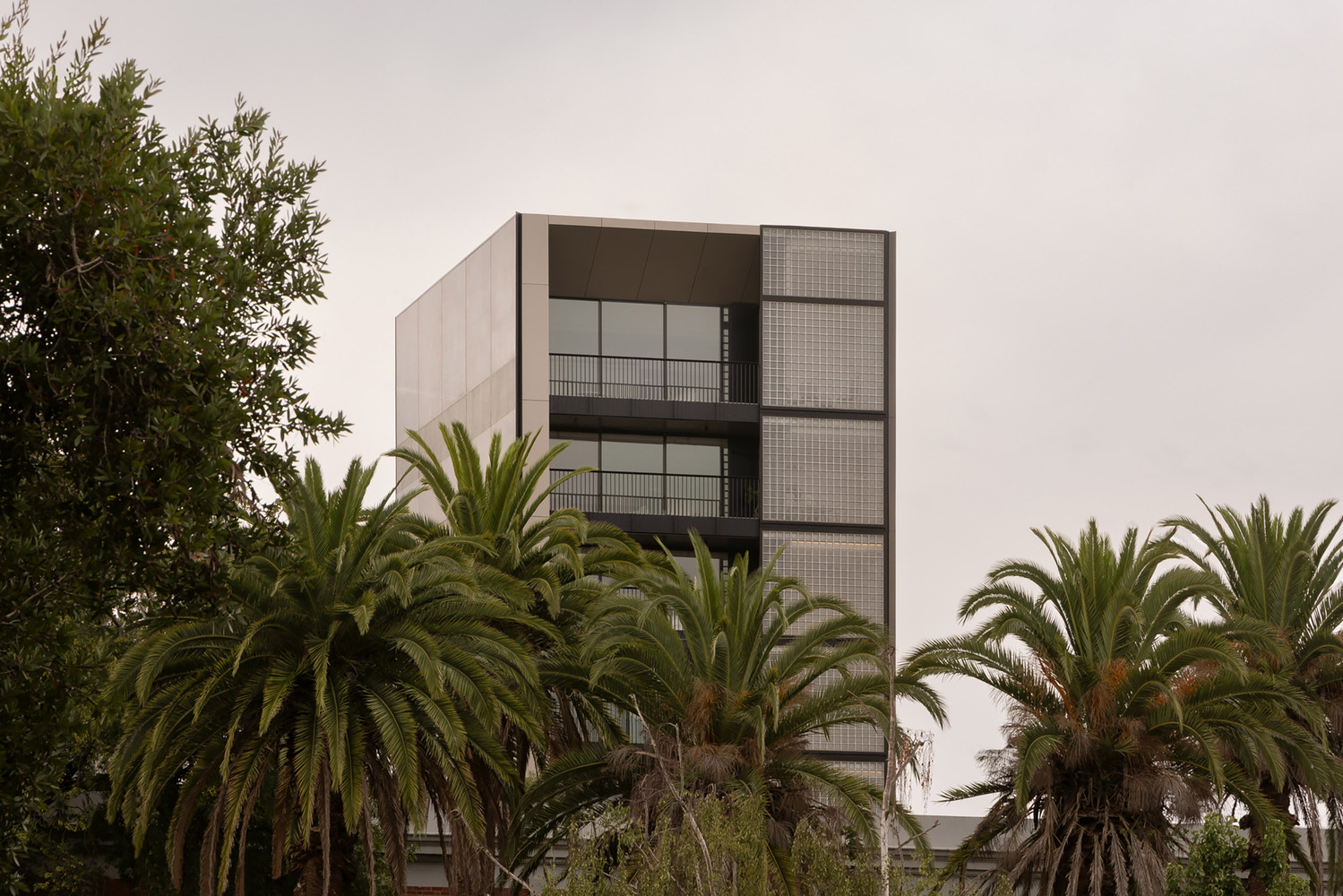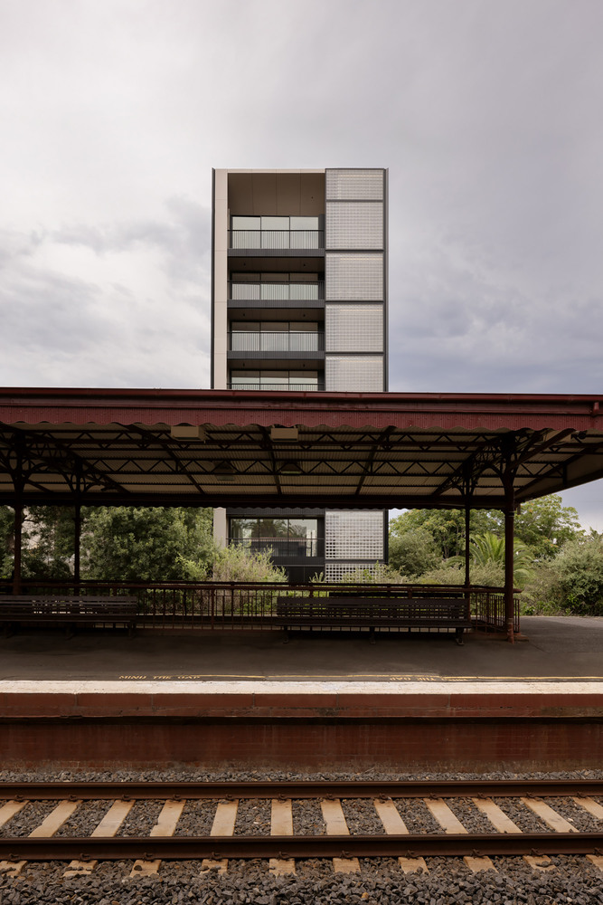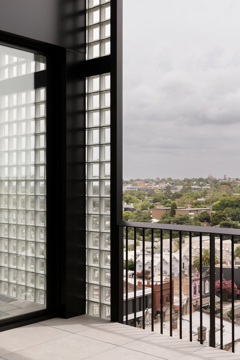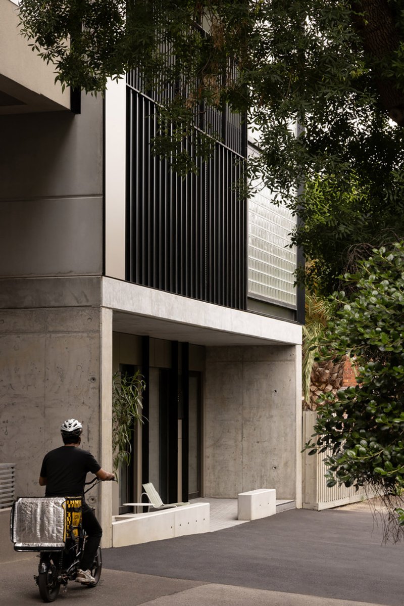 The ground floor, constructed with in-situ concrete for structural integrity in the event of a train derailment, includes a small coffee shop and integrated seating to activate the pedestrian edge. Bluestone cobbles extend from surrounding laneways into the building footprint, creating a tactile transition between public and private. This soft threshold reflects the project’s intent to harmonize with its historic railway context while bringing a modern identity to the neighborhood.