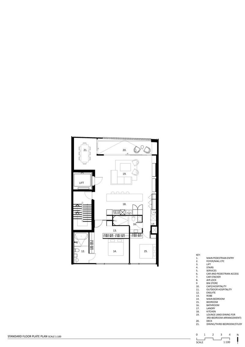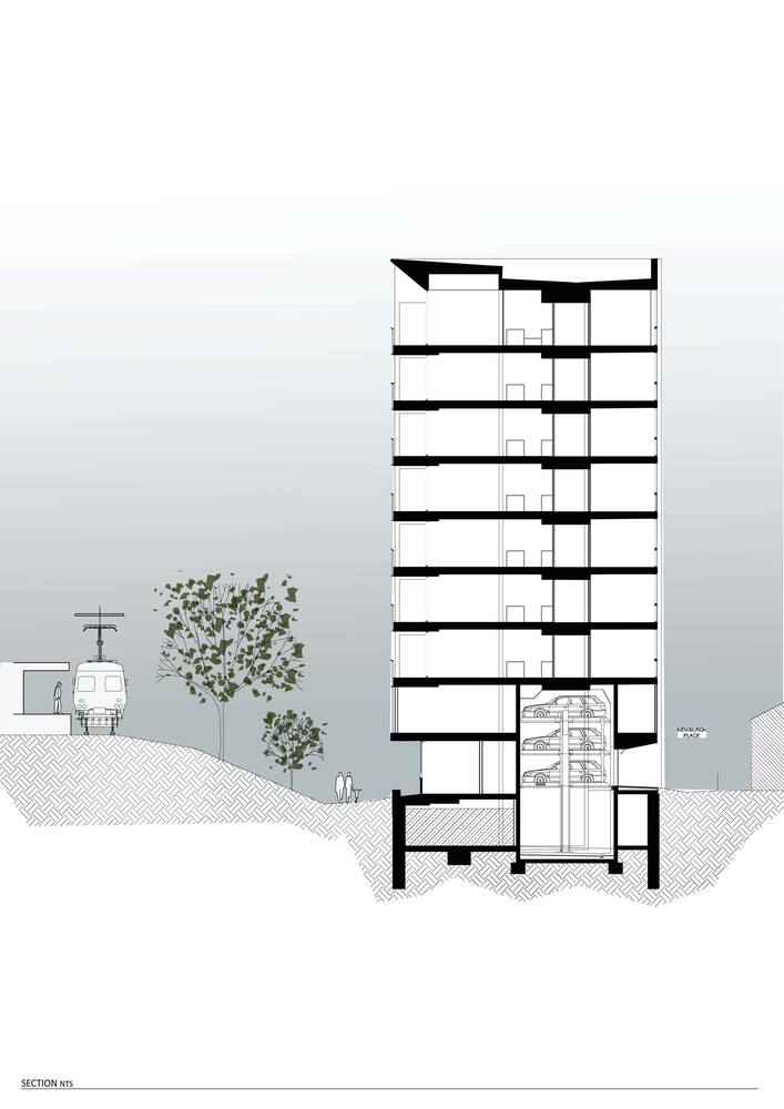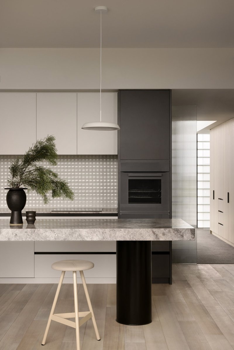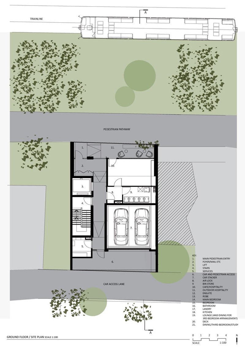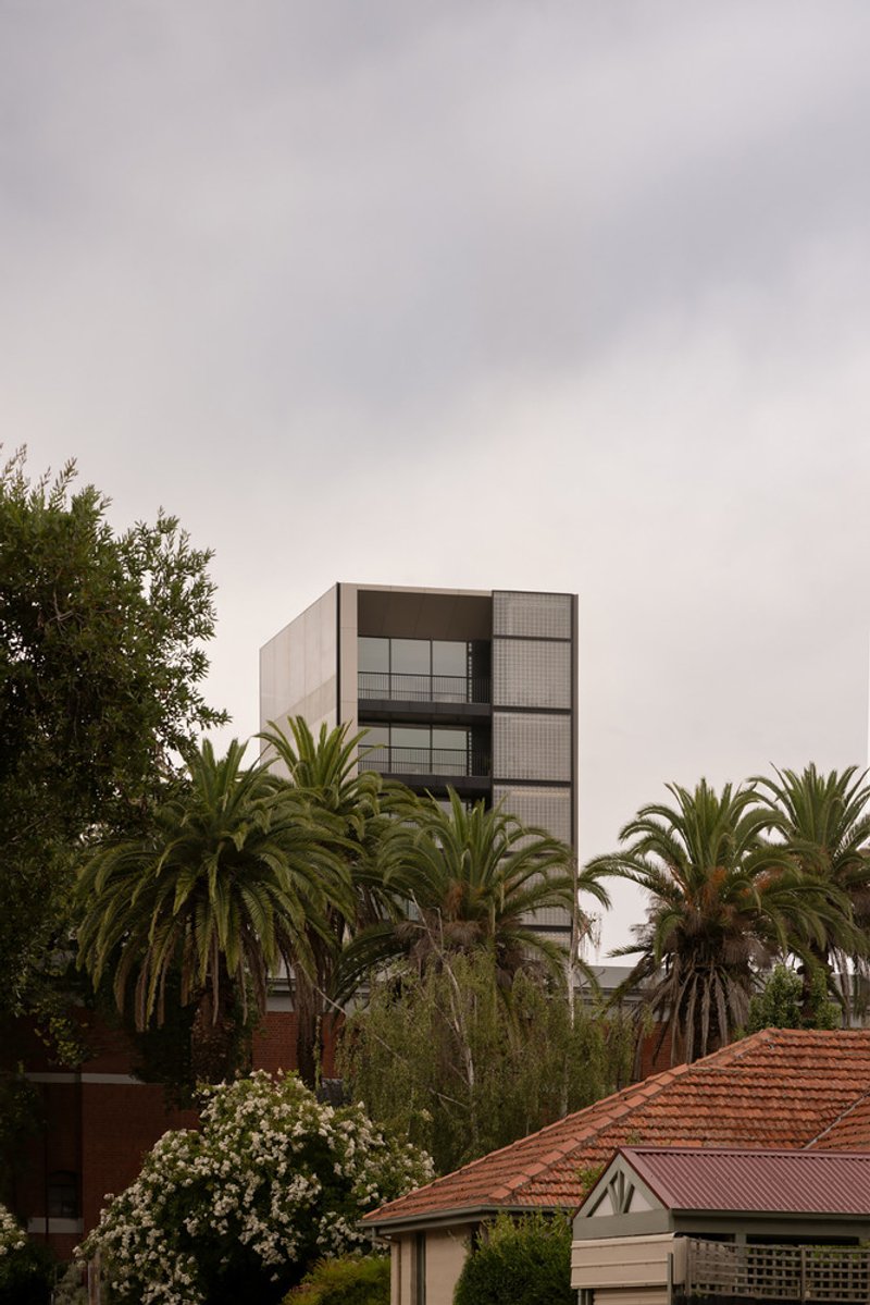 The ground floor, constructed with in-situ concrete for structural integrity in the event of a train derailment, includes a small coffee shop and integrated seating to activate the pedestrian edge. Bluestone cobbles extend from surrounding laneways into the building footprint, creating a tactile transition between public and private. This soft threshold reflects the project’s intent to harmonize with its historic railway context while bringing a modern identity to the neighborhood.