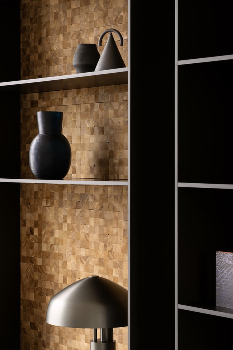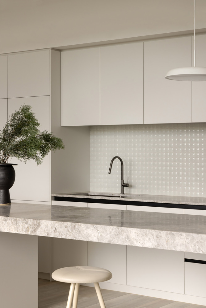 The minimalist grid expressed on the exterior carries through the interior, where timber panels, ceramic tiles, and natural stone surfaces reflect the building’s modular ethos. The contrast between raw finishes and soft illumination defines the apartments’ character, enhancing liveability without sacrificing spatial economy. A penthouse level and one two-storey unit introduce variation within the otherwise repeated floorplates, enriching the experience of modular living with moments of bespoke design.