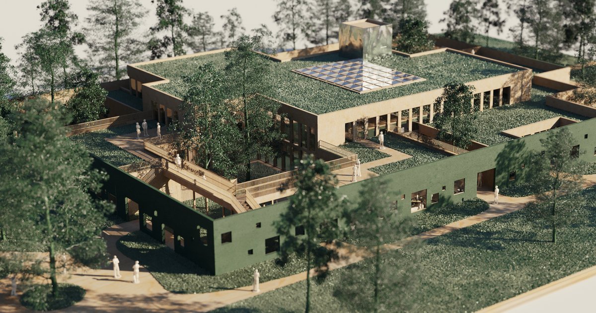 The walls of urban interiors are finished with wood, while the openwork wall surrounding the building from the outside, with green plaster. As a result, seen from the outside, the building gives an impression of hovering over the surrounding vegetation. After entering the atrium, it becomes visually embedded in the ground.