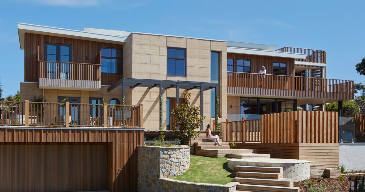 - Primary Materials: Rammed earth, blackbutt timber, recycled elements