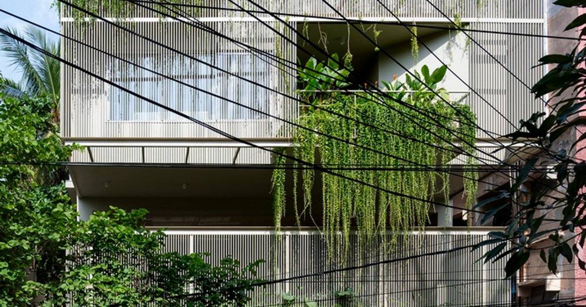 The western facade is protected by a metal veil, softened by strategically placed planters, which shield against harsh sunlight while contributing to the residence’s verdant character. This secondary skin simultaneously provides privacy and visual relief, contrasting with the monotonous urban streetscape outside.