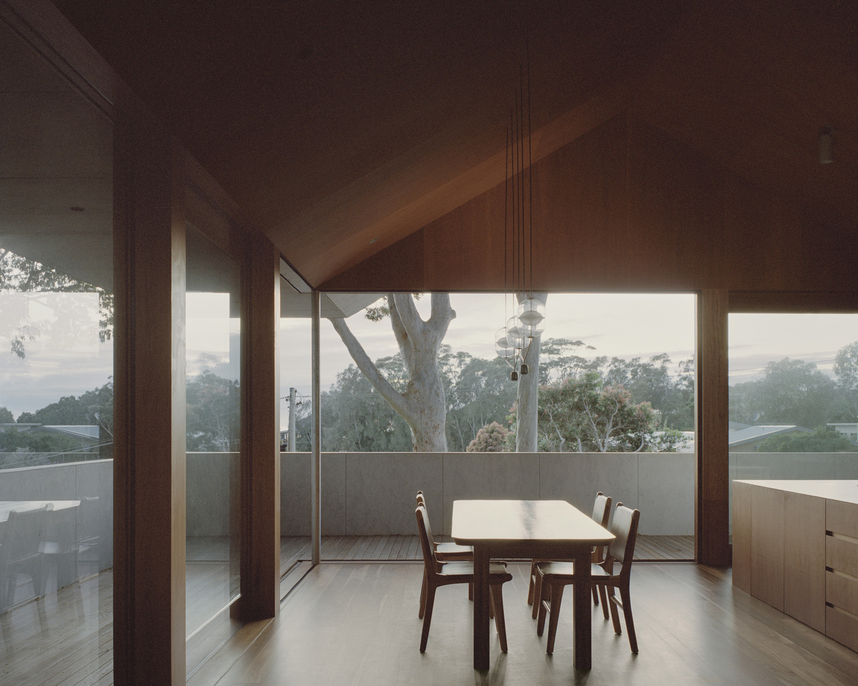 With a focus on sustainable architecture, the design of Mossy Point House is both pragmatic and poetic. The home's cement-sheet cladding mimics the smooth, silvery bark of the surrounding trees, paying homage to both the local landscape and the original fibro shack that once occupied the site. Resting on a foundation of parallel block-work walls, the house balances between the built environment and the natural surroundings, offering a refined yet practical response to contemporary living.