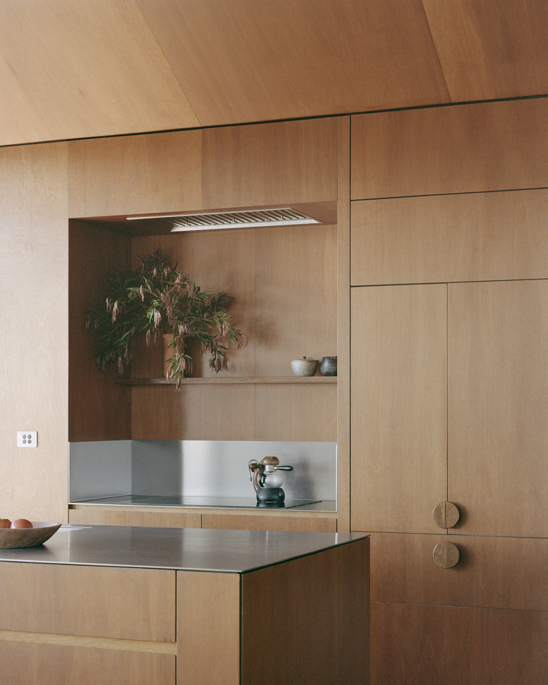 The interior showcases a restrained yet elegant material palette. Plywood-lined walls and Spotted Gum timber flooring infuse the space with warmth and tranquility. The home's carefully crafted chiaroscuro lighting effects, shaped by natural daylight, enhance the connection between indoor and outdoor environments. Each space within the house serves as a frame to observe the breathtaking Tomaga River and coastal views beyond.