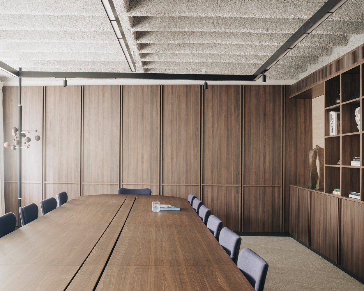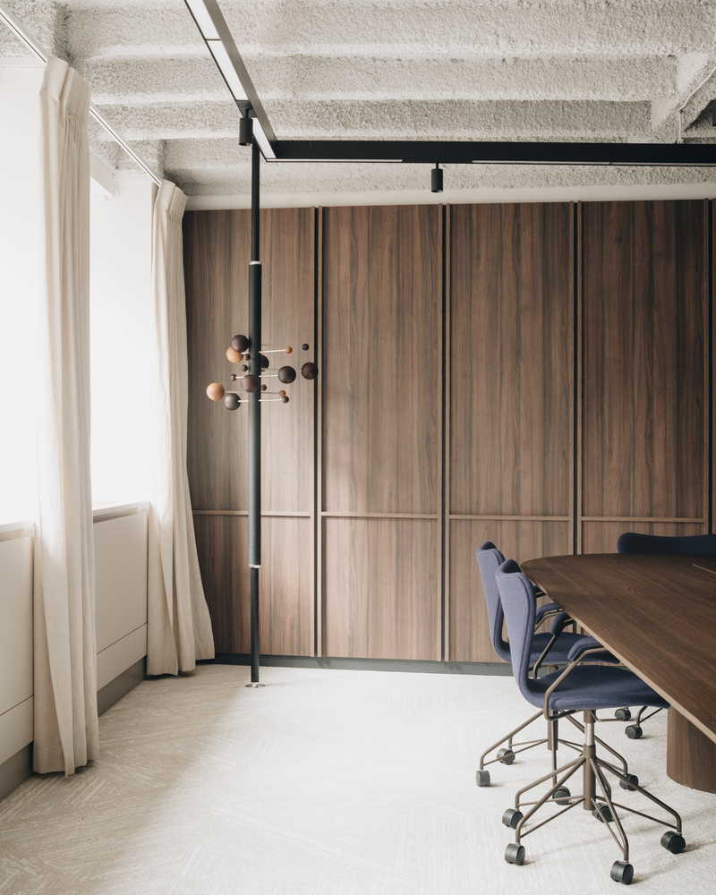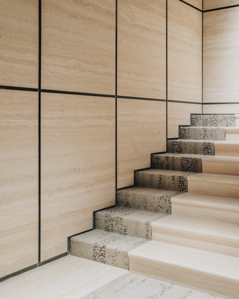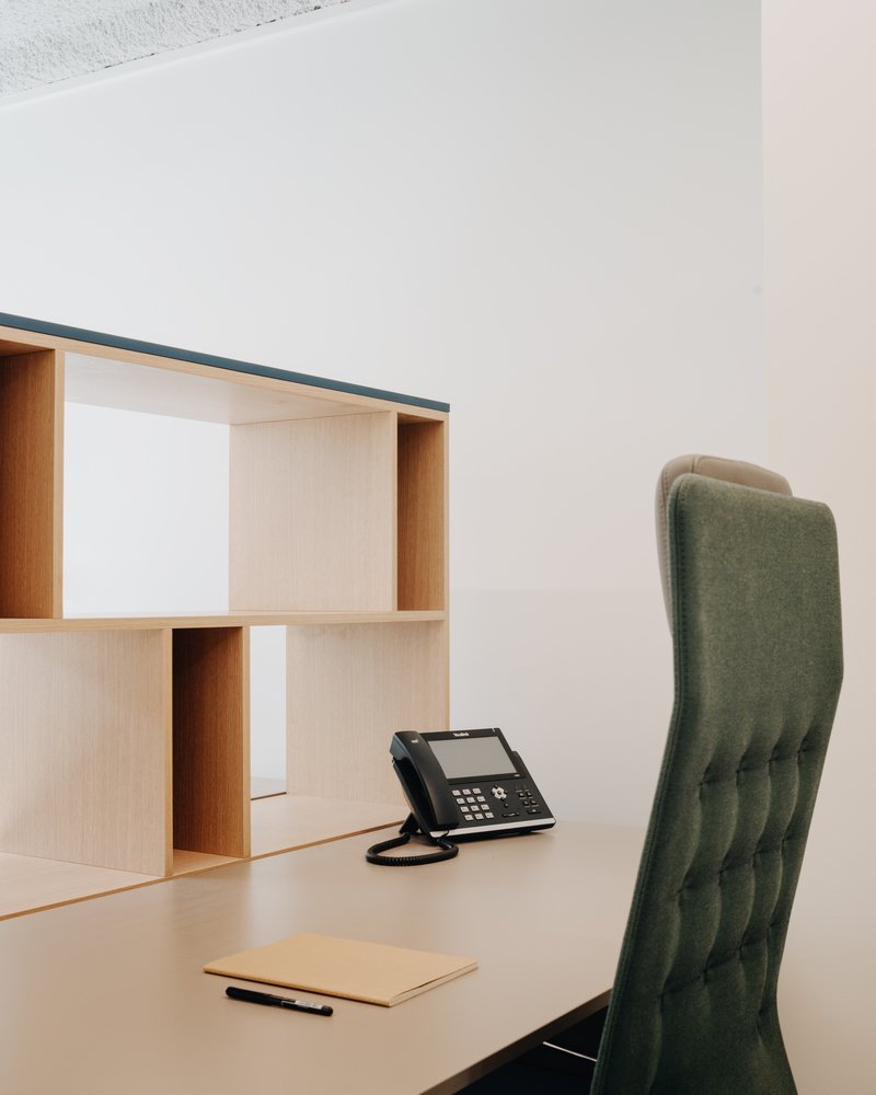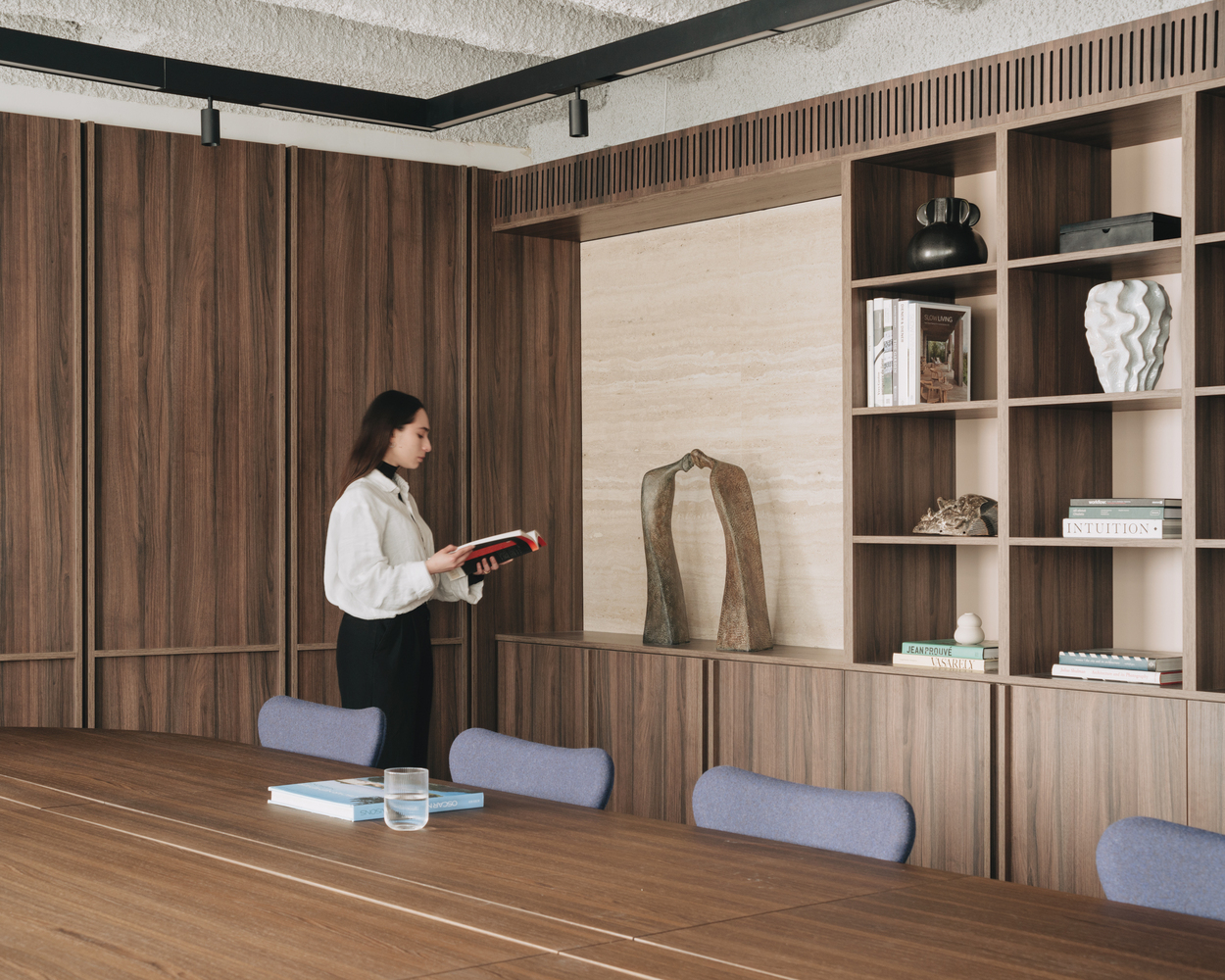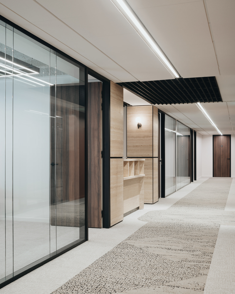 The original building’s concrete structure served as a key source of inspiration. The architects embraced its robust character while introducing warmth and sophistication through walnut and travertine wall paneling, creating a workspace that feels both intimate and professional.