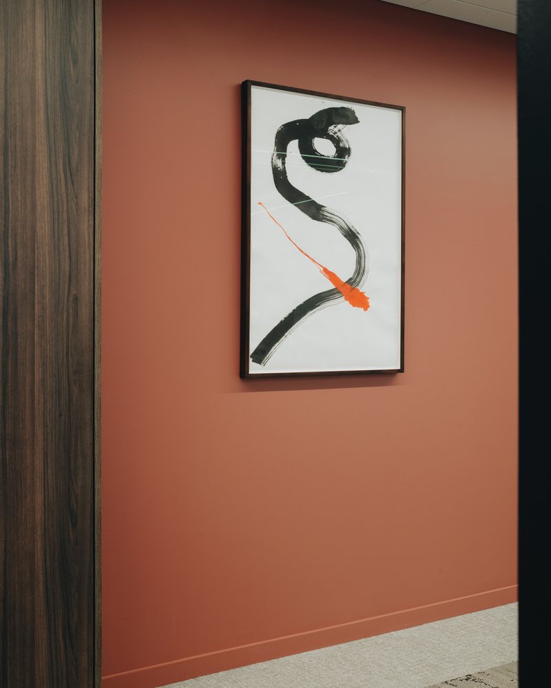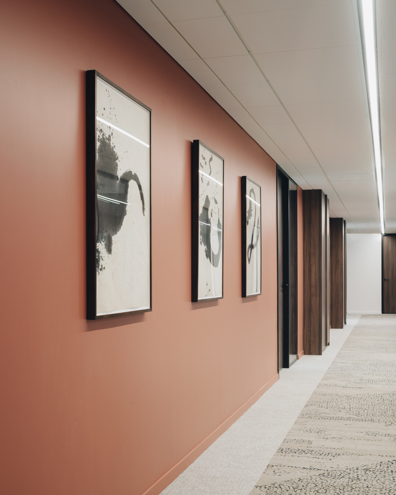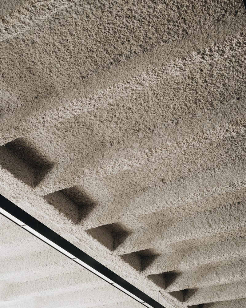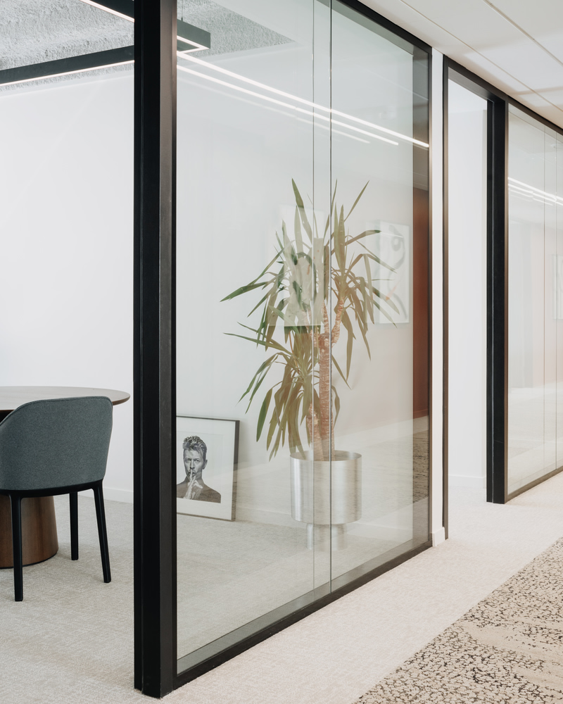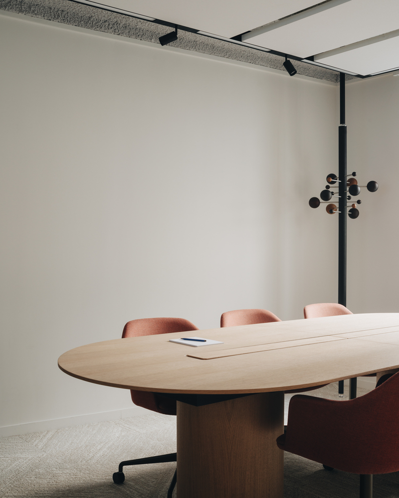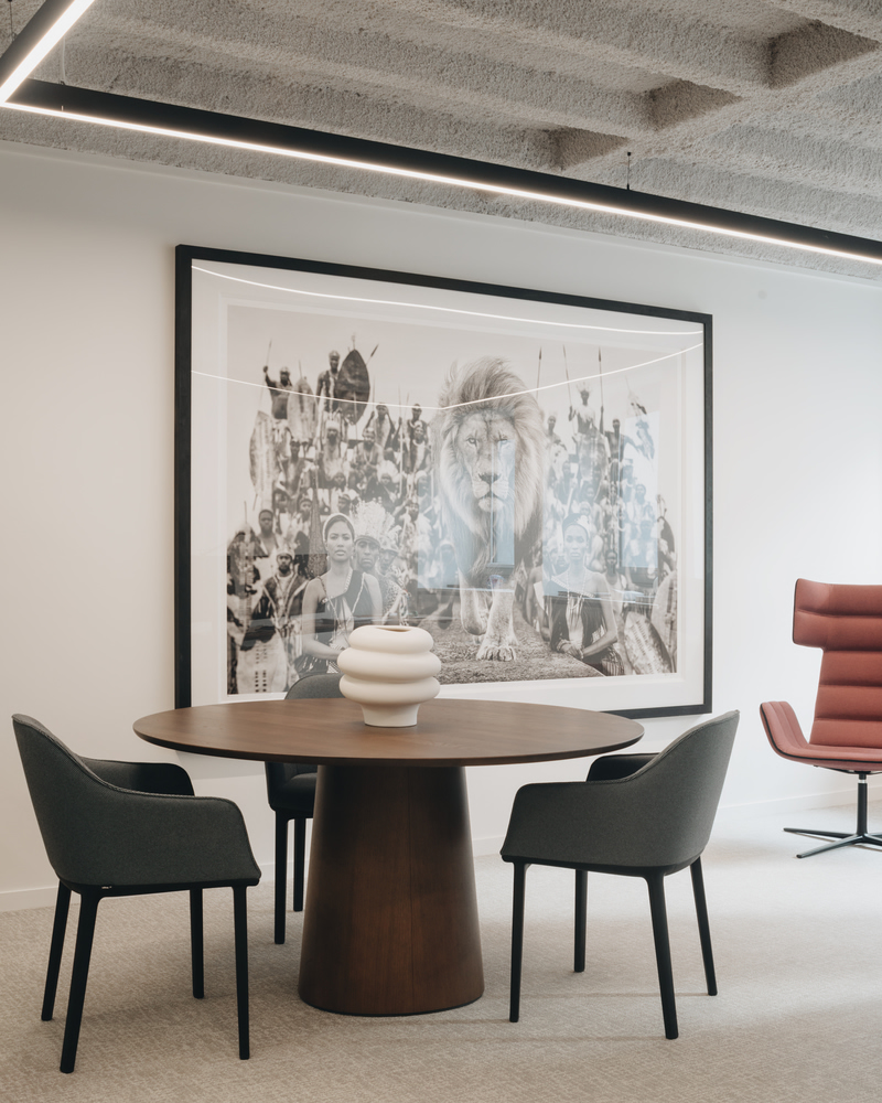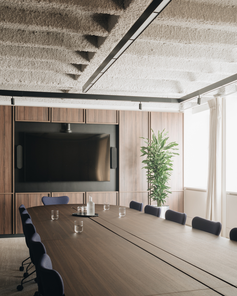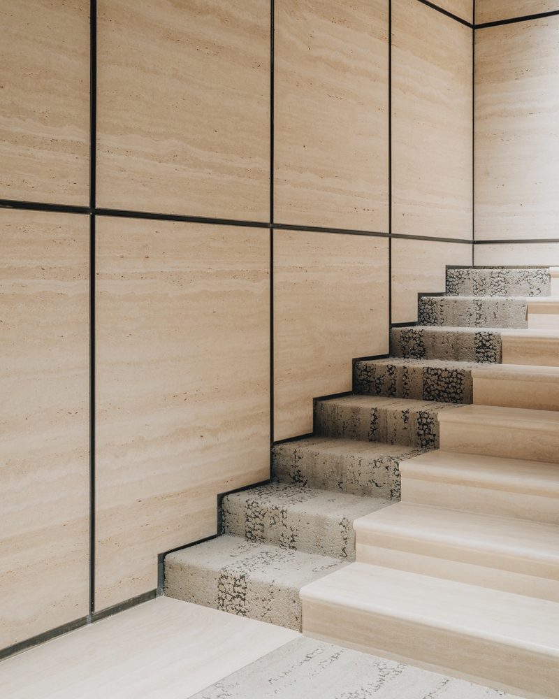 The original building’s concrete structure served as a key source of inspiration. The architects embraced its robust character while introducing warmth and sophistication through walnut and travertine wall paneling, creating a workspace that feels both intimate and professional.