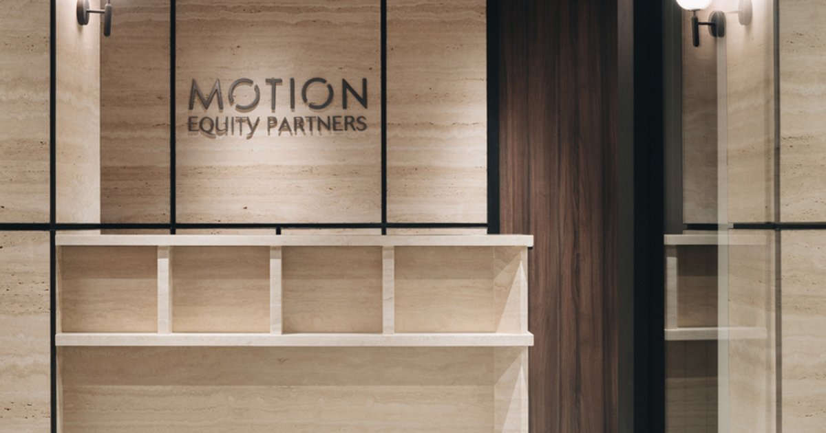 Motion Equity Partners Headquarters in Paris blends 1960s concrete heritage with walnut, travertine, natural light, modular furniture, and collaborative modern office design.