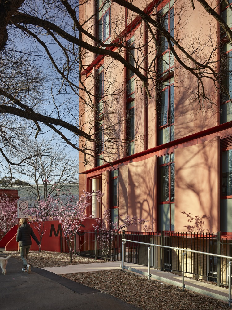 Inspired by the surrounding neighborhood’s architectural vernacular, the building’s façade pays homage to Melbourne’s heritage red brickwork. However, this traditional language is reinterpreted through precast red oxide concrete panels, offering a contemporary expression that aligns with the area’s historic urban fabric.