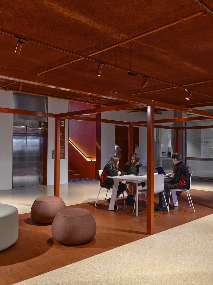 On the second and third floors, students engage with specialized learning spaces for robotics, materials technology, visual and digital arts, and junior science. Breakout zones and meeting rooms support collaboration and cross-disciplinary projects.