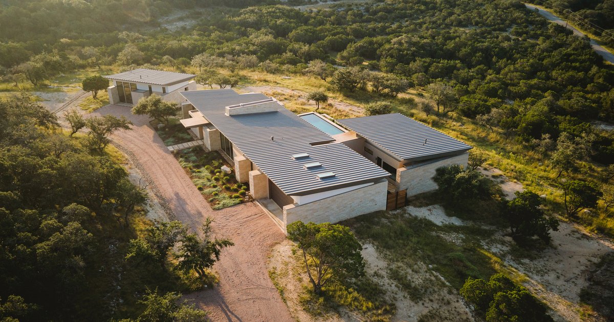 Nestled in the rolling hills of Wimberley, Texas, Mount Sharp Residence by Matt Fajkus Architecture is a stunning example of sustainable residential design. This 4,231-square-foot home seamlessly integrates with its natural surroundings, taking full advantage of the 22-acre site’s unique topography.