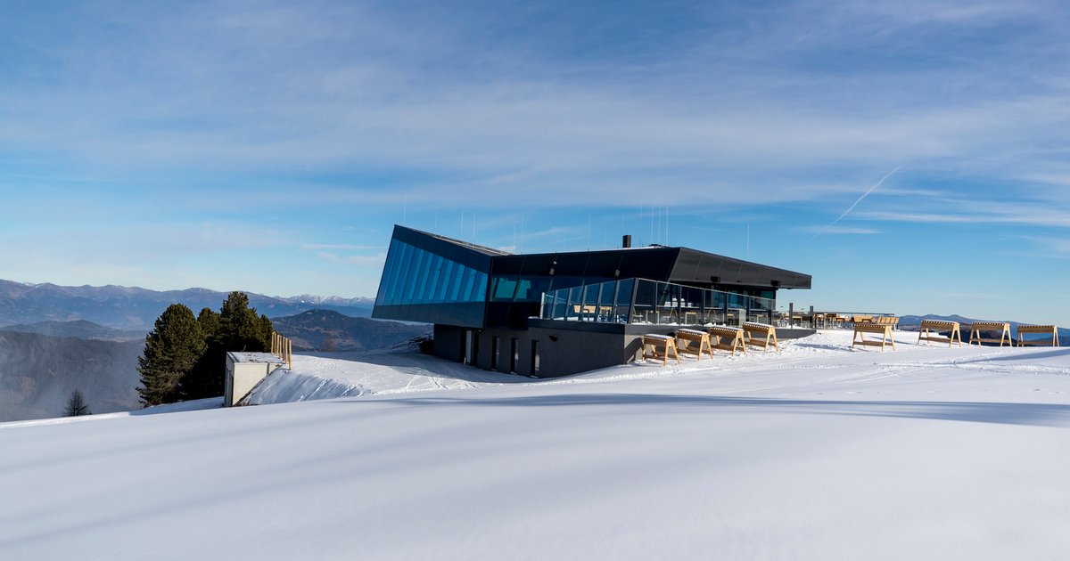 The site's existing structure was a temporary facility with a large umbrella serving as an après-ski bar. Recognizing the need for a more permanent yet visually unobtrusive structure, the architects designed a geometric, rock-like form. The façade’s orientation directly responds to the surrounding views, maximizing openness toward the spectacular alpine scenery. The result is a bold yet harmonious intervention that merges modern aesthetics with the rugged mountain environment.