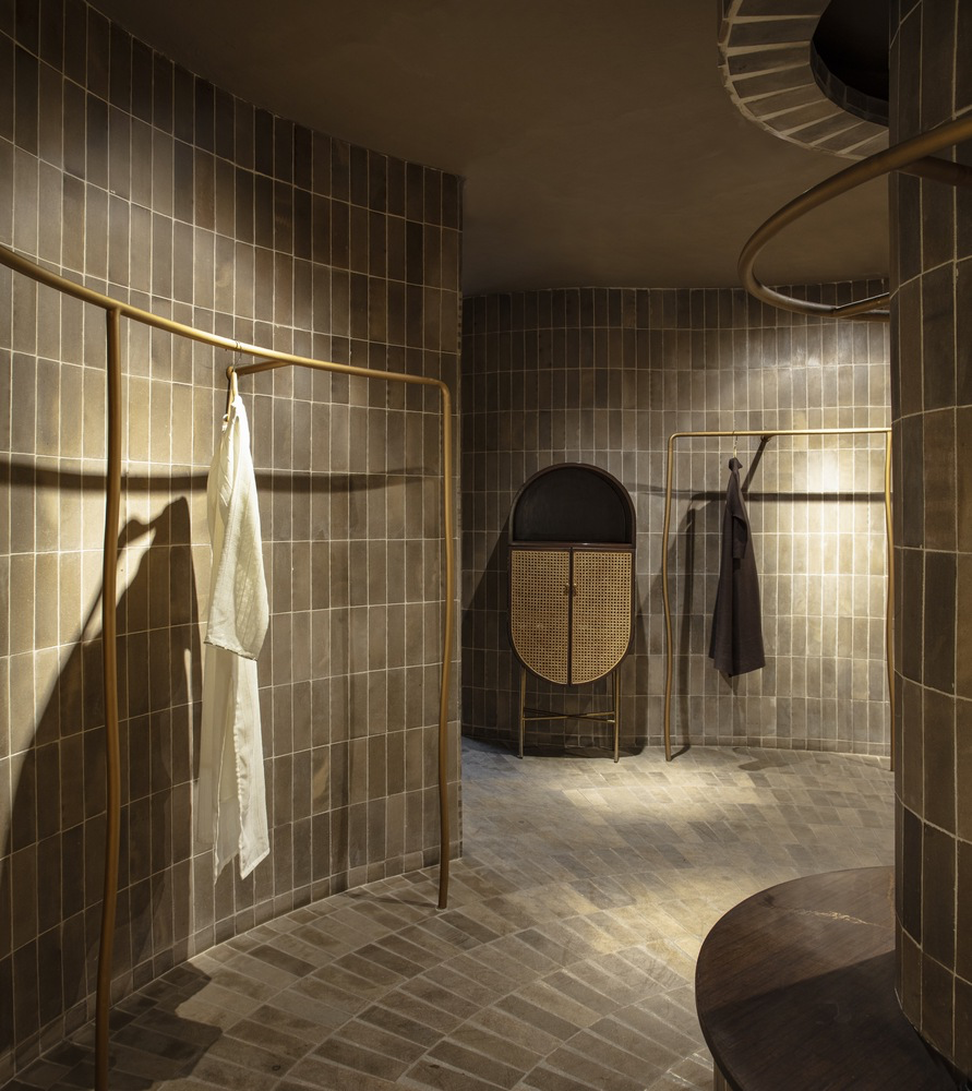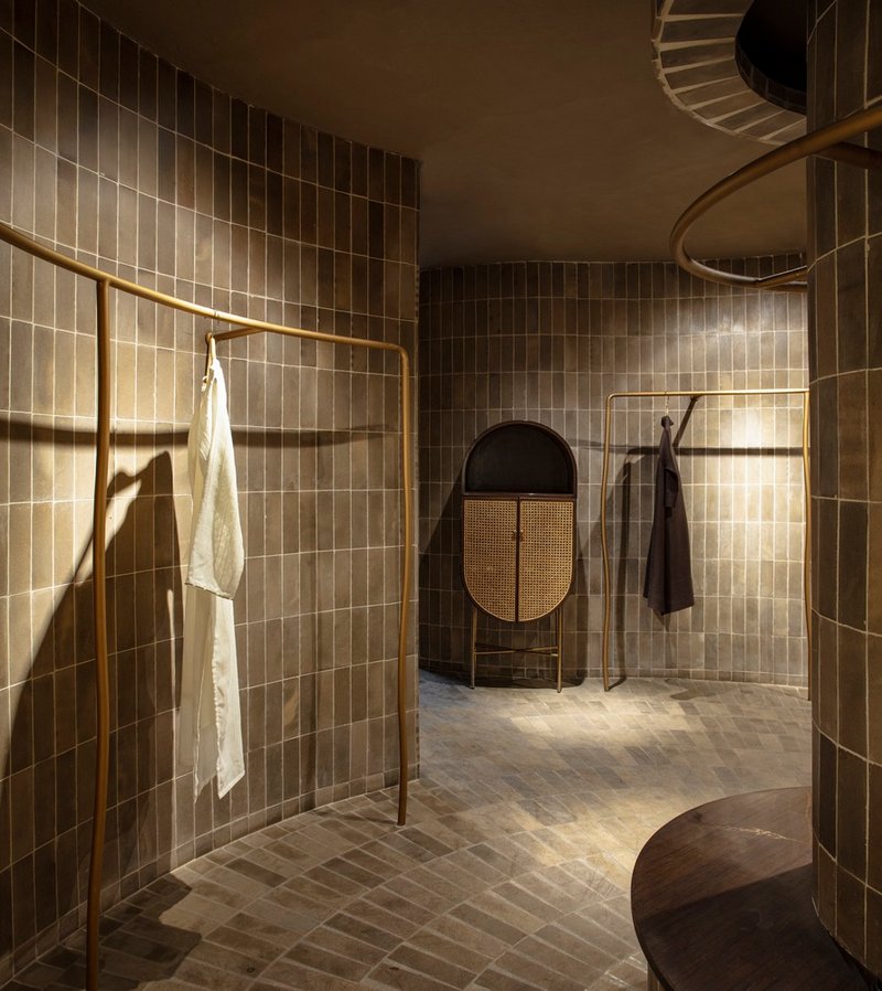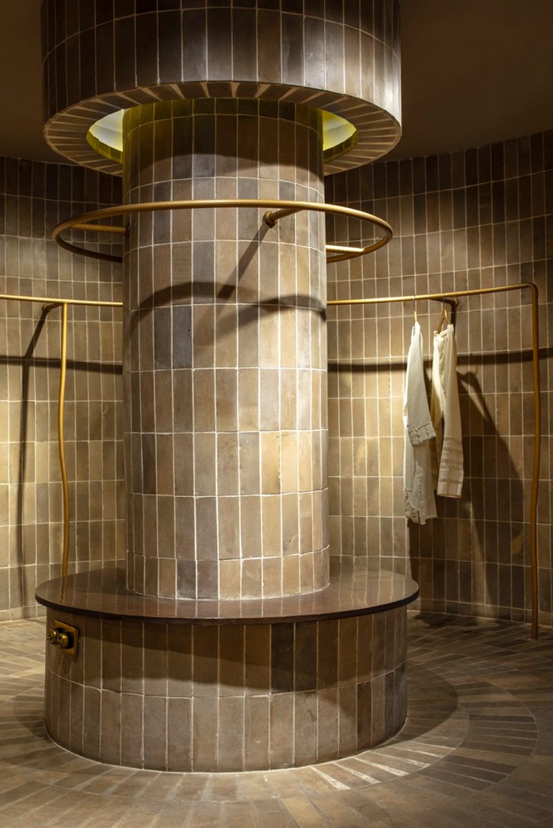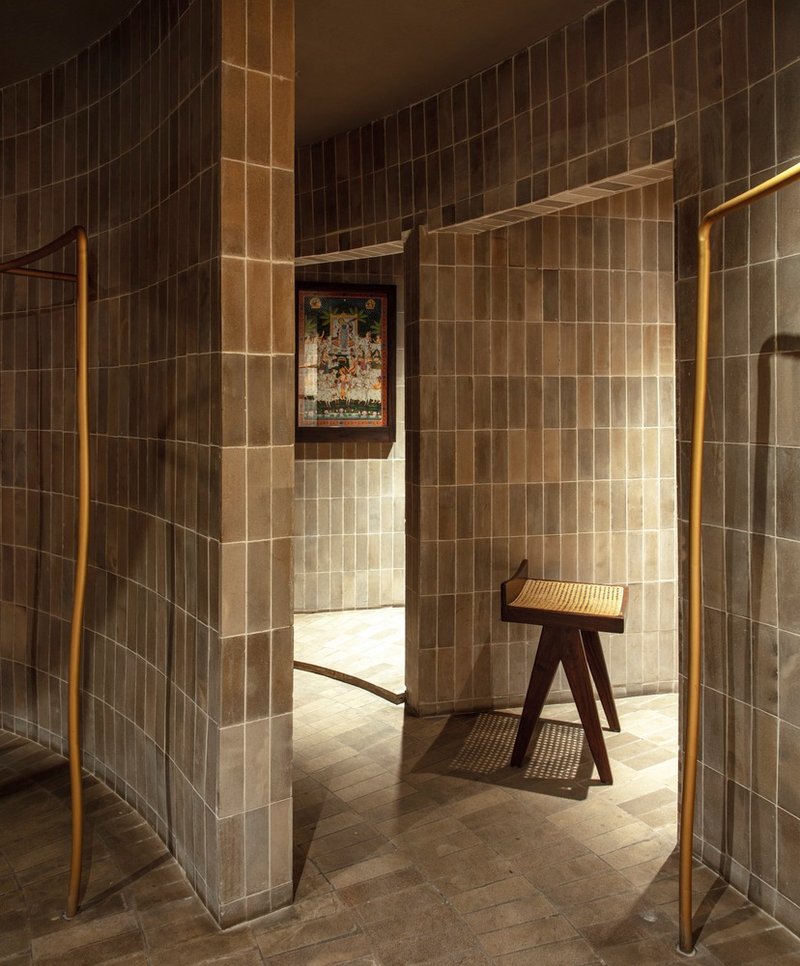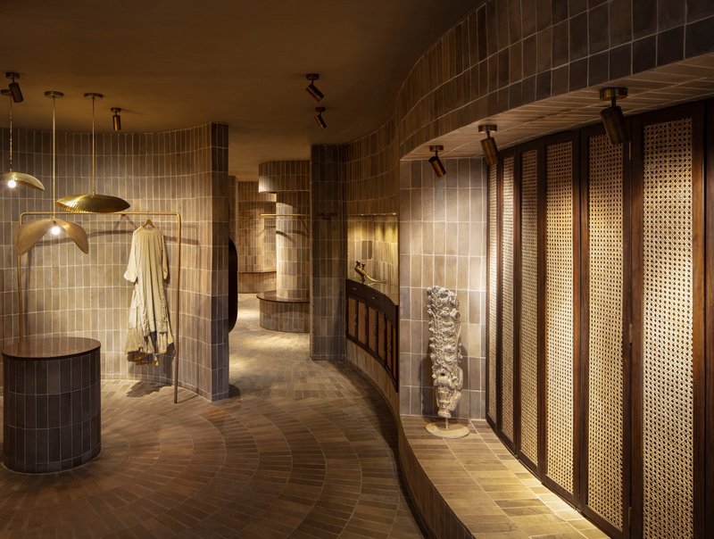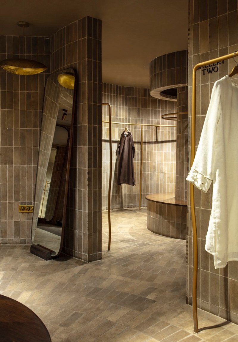 Inside, the humble brick becomes the defining design element. Fired at precise temperatures to achieve warm taupe and brown hues, these bricks animate the space with their raw, textured skin. They travel across walls, floors, and even structural columns, bringing a sense of rhythm and movement. This earthen materiality creates a rich yet minimal canvas that sets the stage for the vibrant garments, allowing craftsmanship in fashion and architecture to coexist and complement each other.