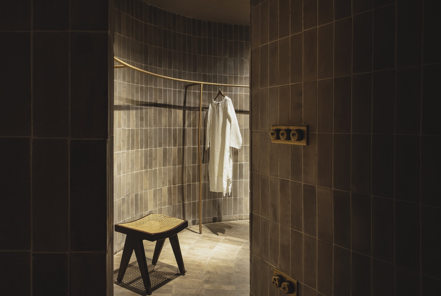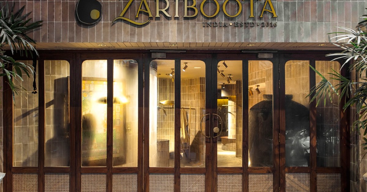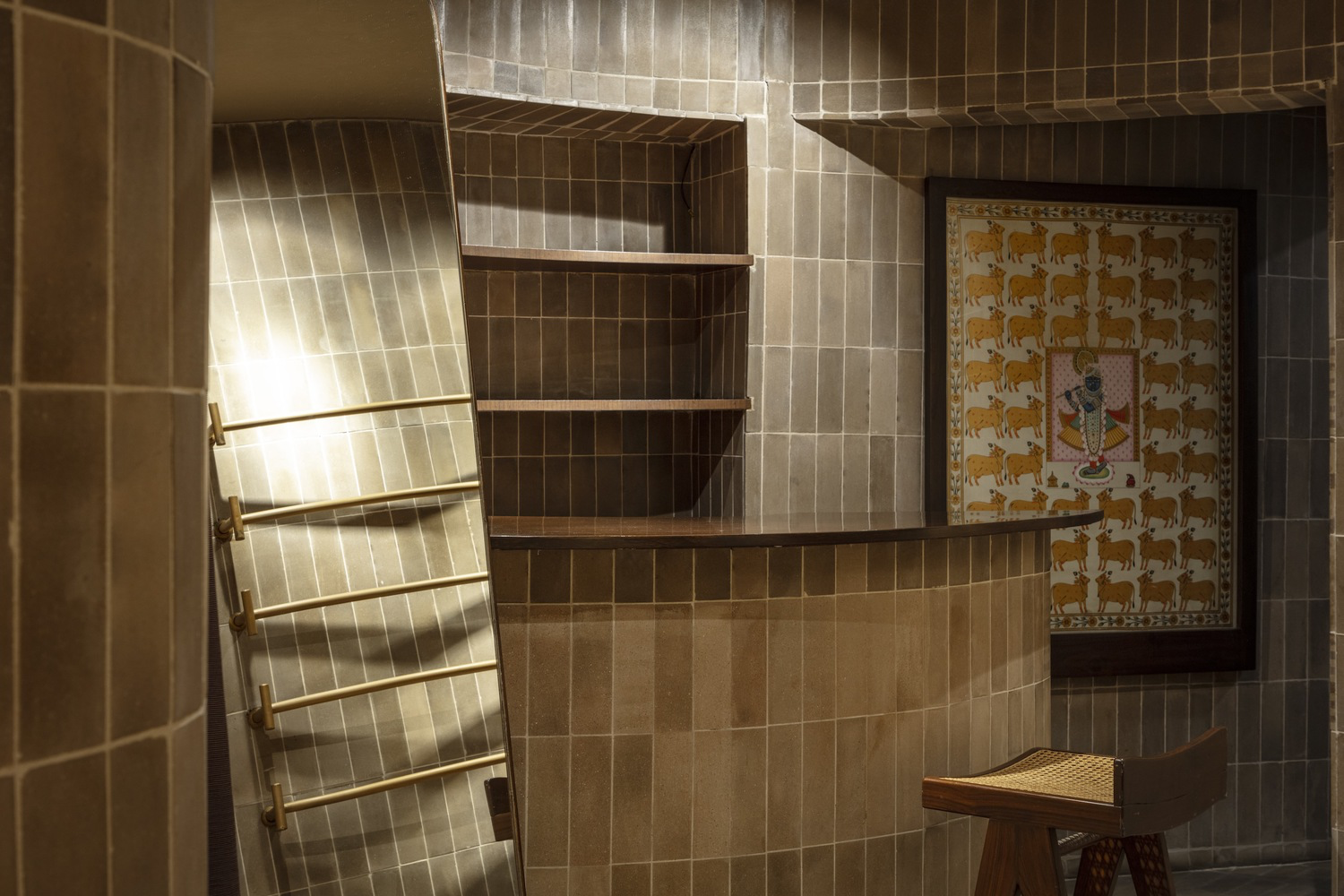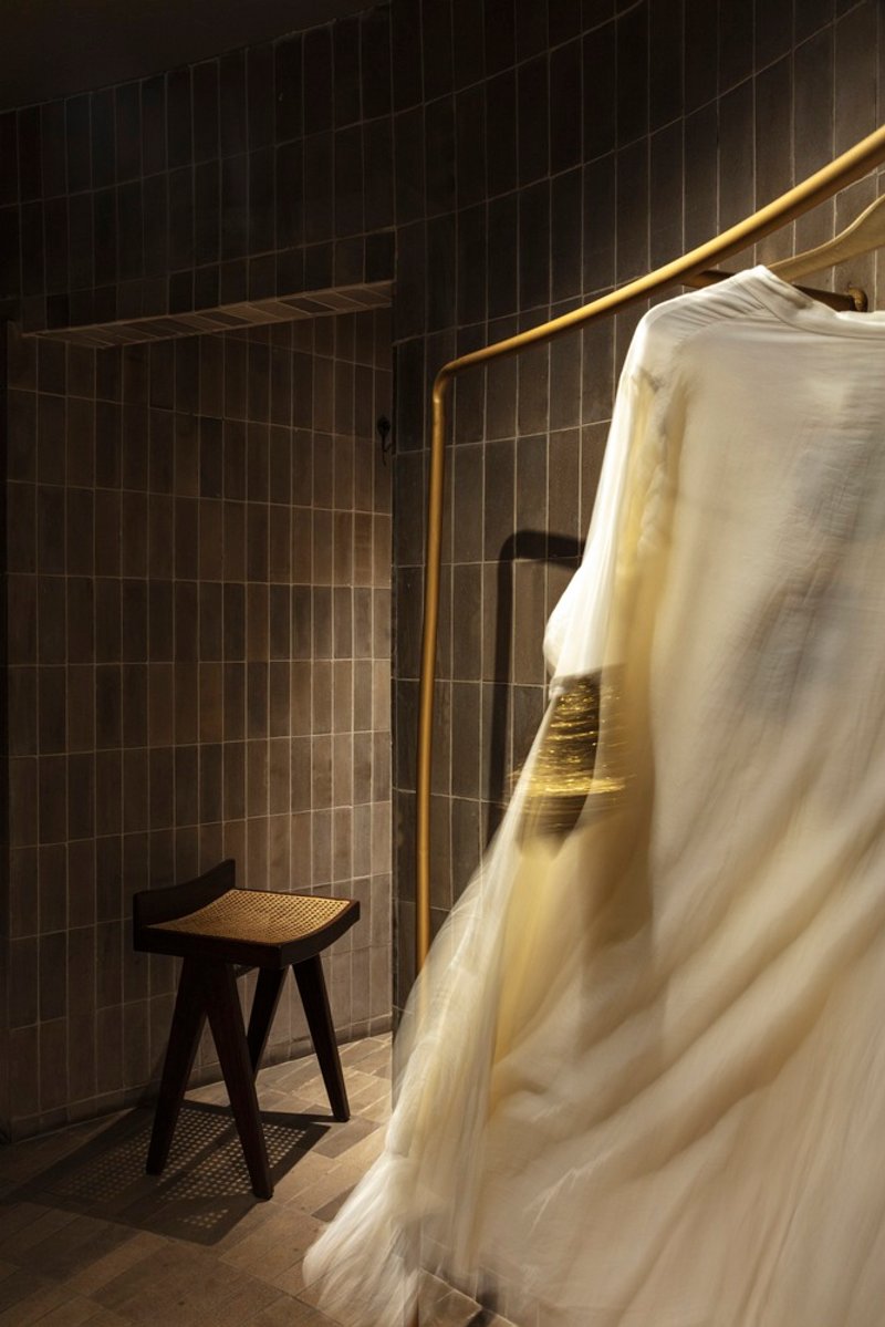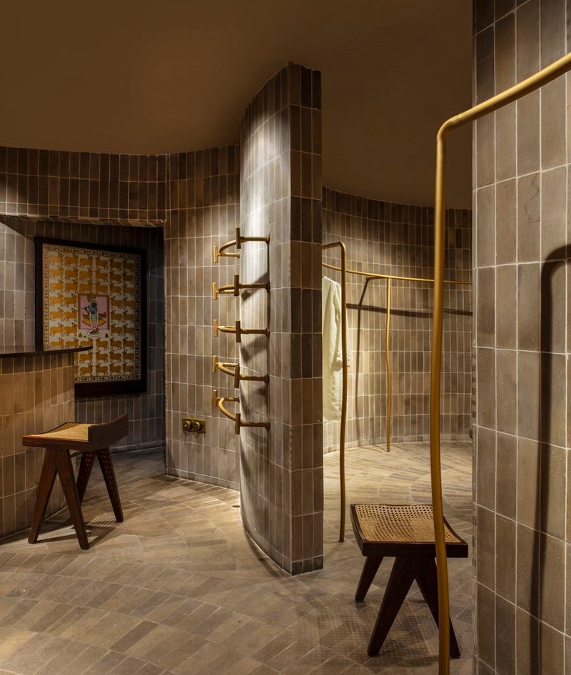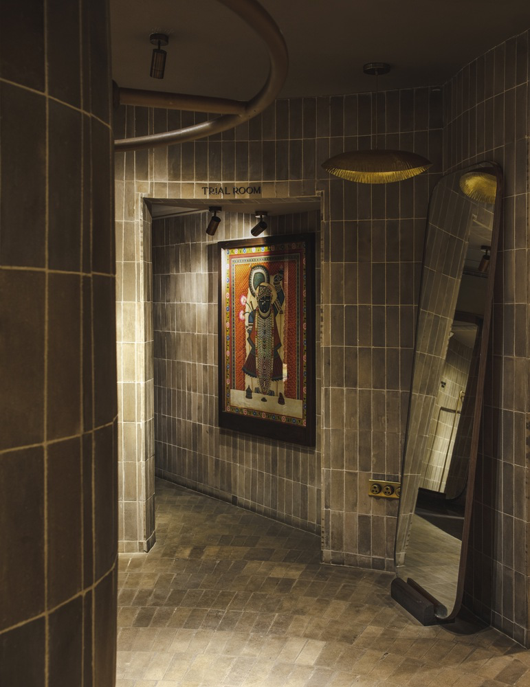 The interior is elevated with a warm palette of brass, wood, and woven wicker, used across furniture, mirrors, and custom lighting solutions by IndiHaus Lighting and White Lighting Solutions. These materials echo traditional Indian design yet are adapted for a modern context. Elements like Studio Fragments’ bespoke furniture pieces reinforce the fusion of past and present, while fitting rooms, inventory zones, and tailoring studios are subtly tucked away to maintain the store’s uninterrupted flow.
