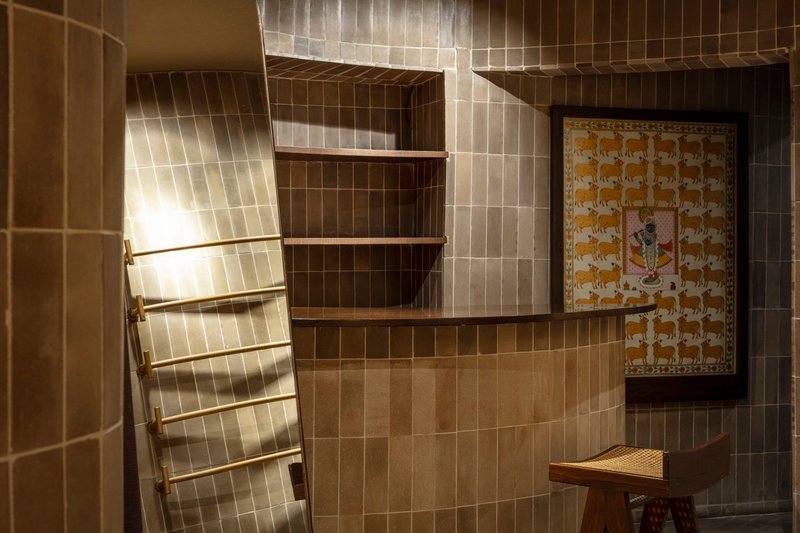 The exterior elevation immediately catches the eye with its fired brick façade, designed in collaboration with Jindal Mechno Bricks using clay sourced from the desert lands of Bikaner, Rajasthan. The structure stands veiled in a rhythmic grid of exposed bricks and wooden folding doors inlaid with wicker and glass, offering both a sense of privacy and transparency. This approach blurs the boundary between the store’s interiors and its urban surroundings, allowing the space to transition fluidly into a communal environment for gatherings or events.
