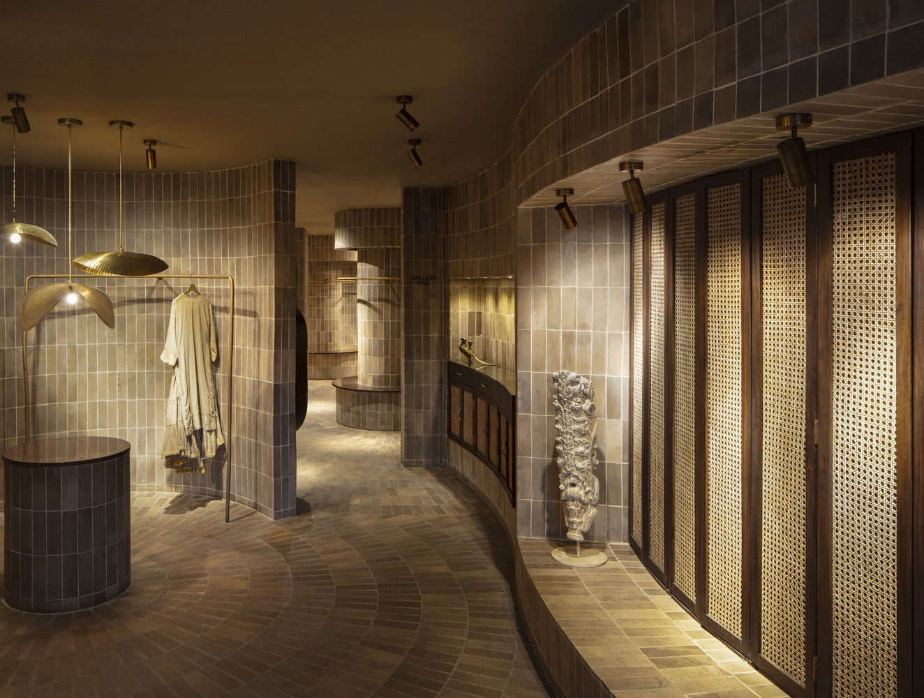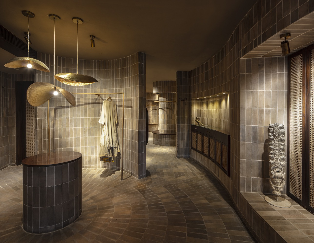 The internal planning deviates from rigid rectilinear layouts. Instead, the space flows through a series of curved, overlapping brick partitions that create interconnected galleries. These undulating forms encourage a journey of exploration—each curve revealing curated display nodes filled with color, textile, and texture. Every element has been meticulously integrated to enhance the retail experience, from mood lighting to artisanal brass fixtures.
