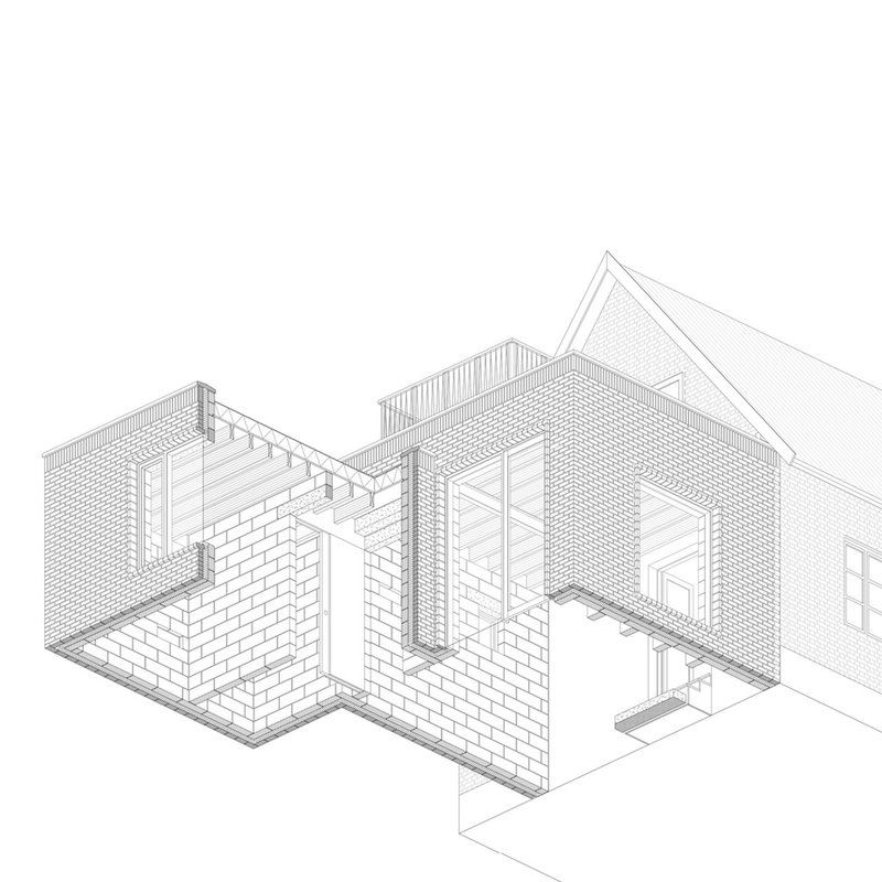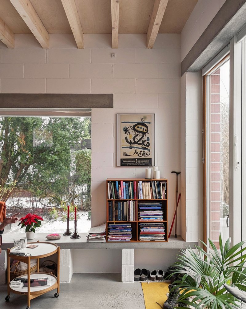 The house showcases traditional materials like brick, wood, and concrete in a modern context. The structure's visible layers—each with distinct properties—are designed to educate onlookers about the building process, emphasizing the use of sustainable, breathable materials such as mineral silicate paint on blocks and wax-treated wooden beams.
