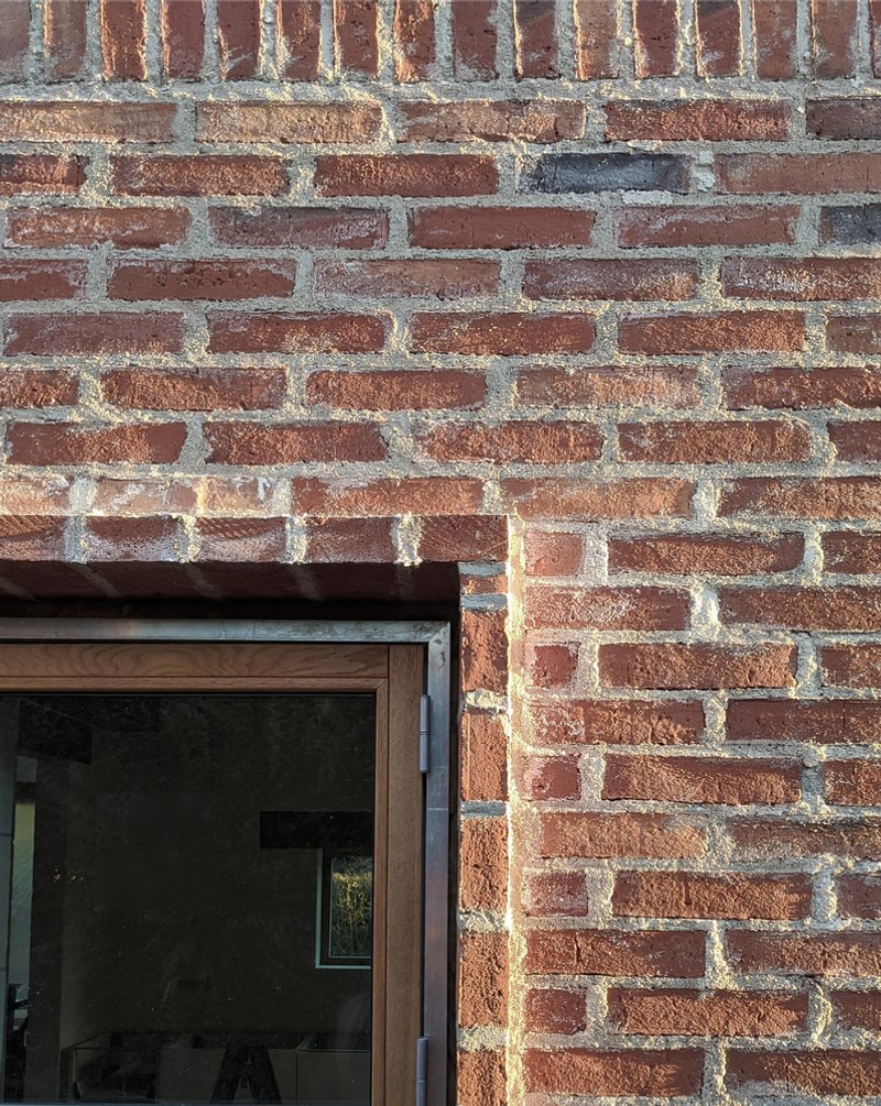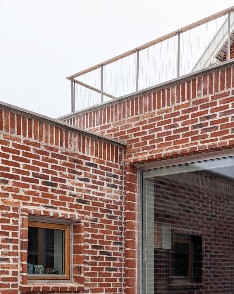 The design includes features such as strategically placed windows for natural light and ventilation, reducing the need for artificial heating and lighting. The use of lime mortar not only adds to the aesthetic but also ensures that bricks can be reused, promoting sustainability.