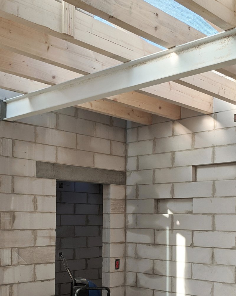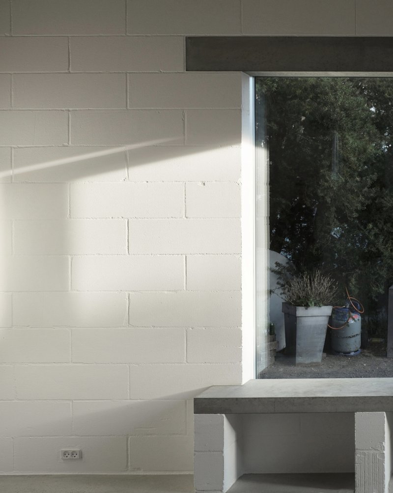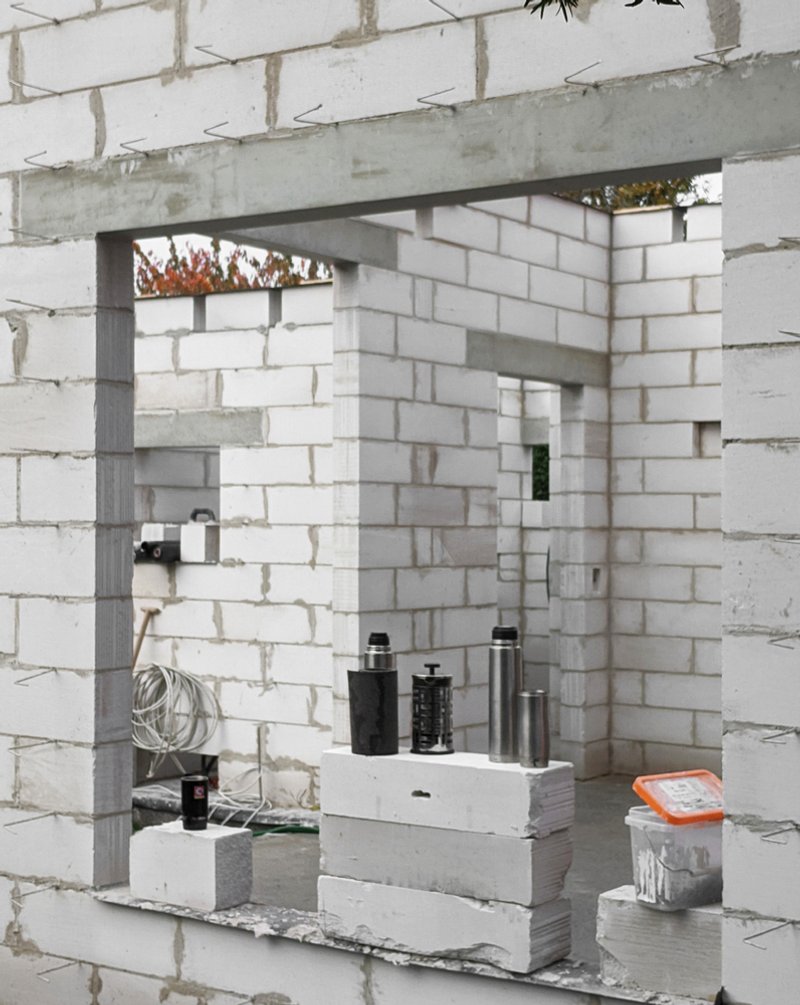 The aesthetic approach combines minimalism with functionality, using a palette that reflects natural materials and colors. The rough, unfinished look of the brickwork juxtaposed with the smoothness of the large visible blocks inside creates a dynamic interior atmosphere.