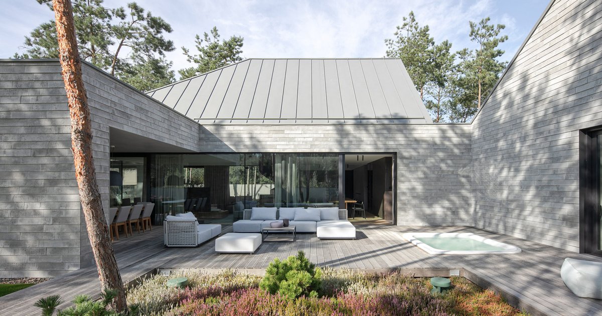 A modern forest house design in Poznań blending modular architecture, natural light, and intimate courtyards to harmonize with towering pine trees.