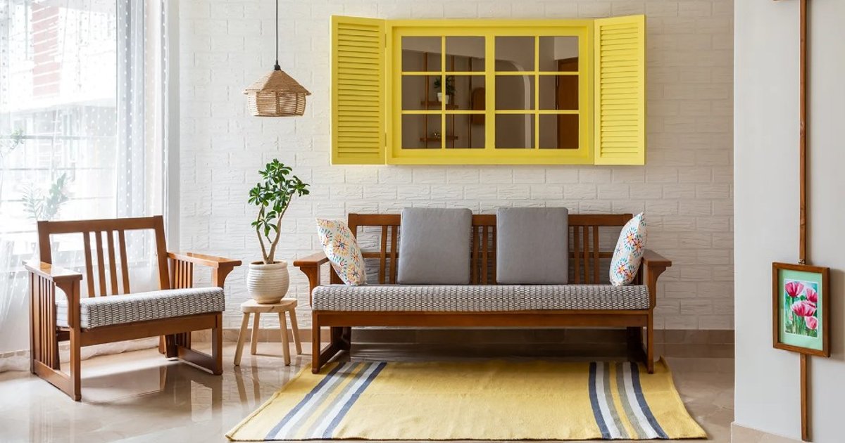 Located in Mumbai, this home features two bedrooms, a kitchen, and a living area. However, the angular walls and corners presented some design challenges. To overcome these, the designer utilized the compactness of the spaces to their advantage. For example, they turned a nook in the children's room into a seating area with colourful decals and soft peach upholstery. Additionally, the family requested a simple dining setup due to the limited space, so the designer created a collapsible table that can be hung from a yellow arch painted on a living room wall. Even the smallest details, such as the edges of study table drawers in the primary bedroom, were utilized to optimize space and improve comfort. The designer explains that by removing the perpendicular edge, the desk appears visually lighter.