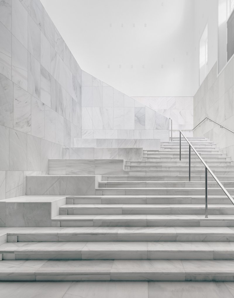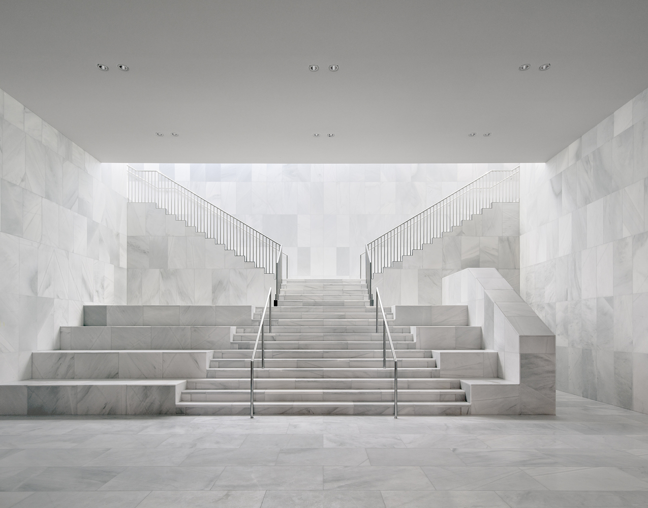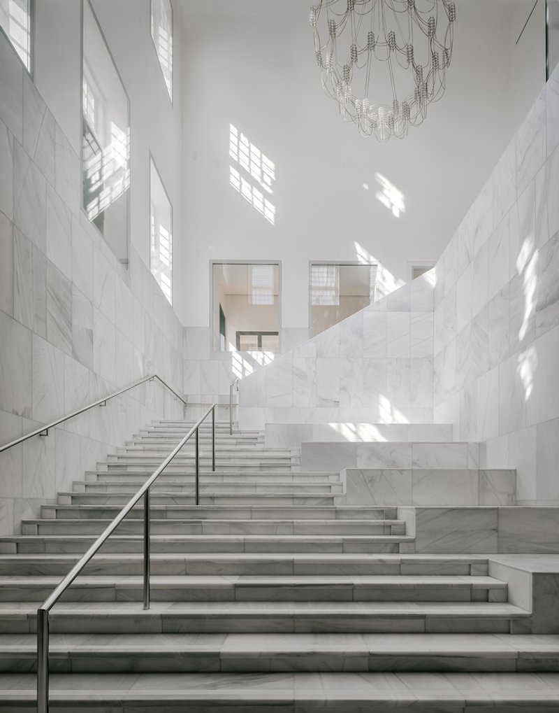 Descending into the underground levels, visitors encounter the Grand Foyer, a light-filled central hub that links the old and new sections of the palace. Directly beneath the fountain, a wind rose marks the spatial core, guiding guests toward temporary exhibition halls, the House of Orange permanent exhibition, or the Junior Palace children’s museum. High ceilings, marble finishes, and walnut details create an atmosphere of both monumentality and intimacy, staying true to the palace’s historical grandeur.