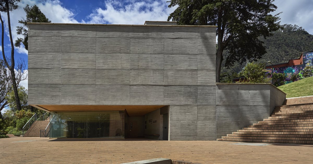 The building’s placement is central to its architectural narrative. Rather than occupying a dominant stance on the slope between the Faculty of Architecture and the Campito de San José—one of the oldest pavilions on campus—the architects chose to partially sink the building into the terrain. Two-thirds of its volume lies below ground, allowing the landscape and circulation patterns to remain uninterrupted, while preserving open views toward the Eastern Hills of Bogotá. This gesture reflects dual intent: acoustic control and spatial humility.