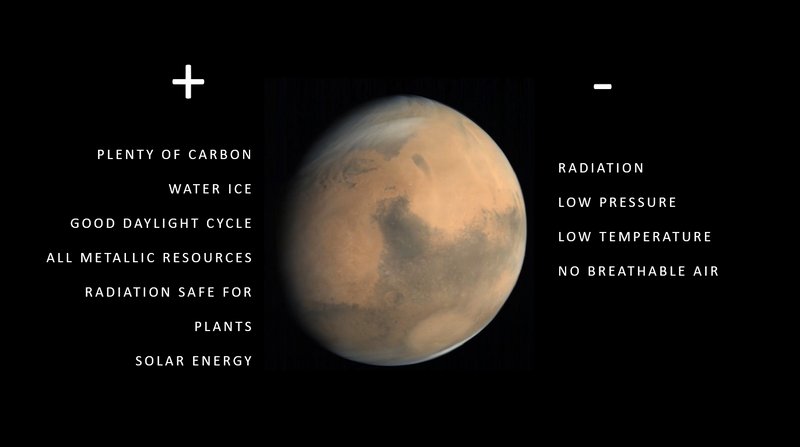 But there are a lot of challenges to overcome: too much radiation for humans, very low pressure, low temperatures, no breathable air.