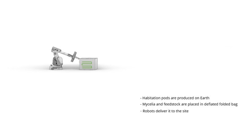 The habitation pods are produced on Earth. The mycelia and feedstock are placed inside the folded bag. When arriving to Mars robots will deliver it on the site.