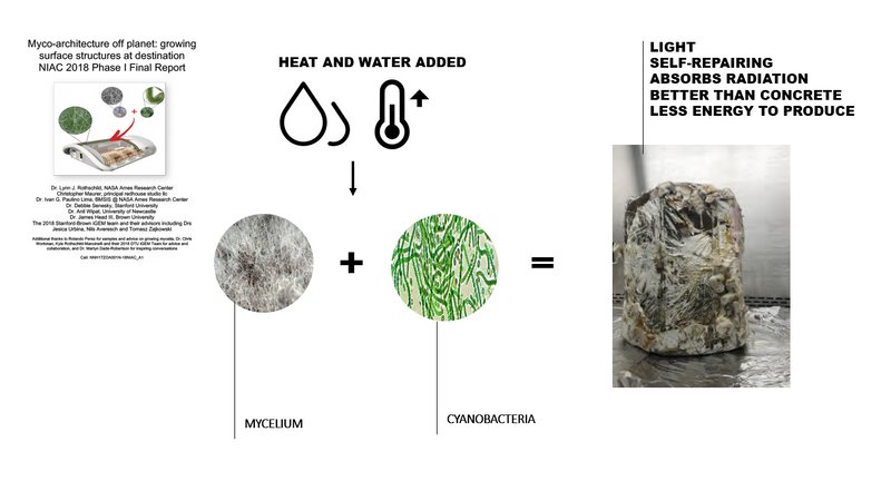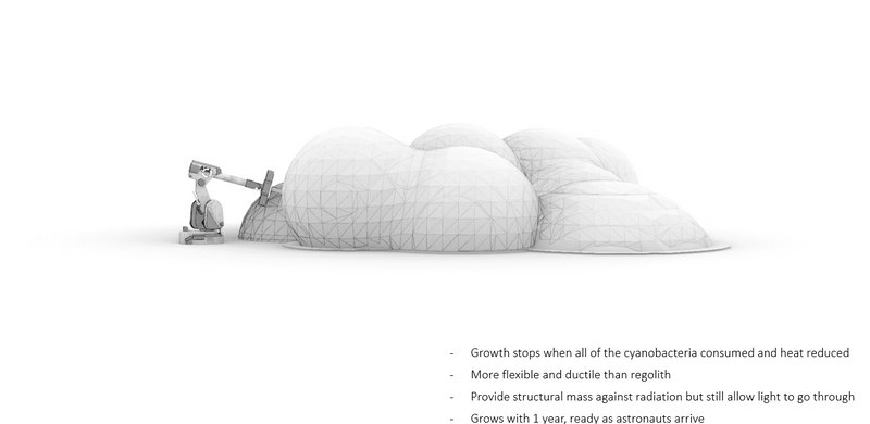 This research stated that in theory it is possible to grow structures on Mars using the process of growth of mycelium and cyanobacteria. Mycelium in basic terms, is the threads that fungi use to build themselves. And cyanobacteria would be used as a feedstock to mycelia.