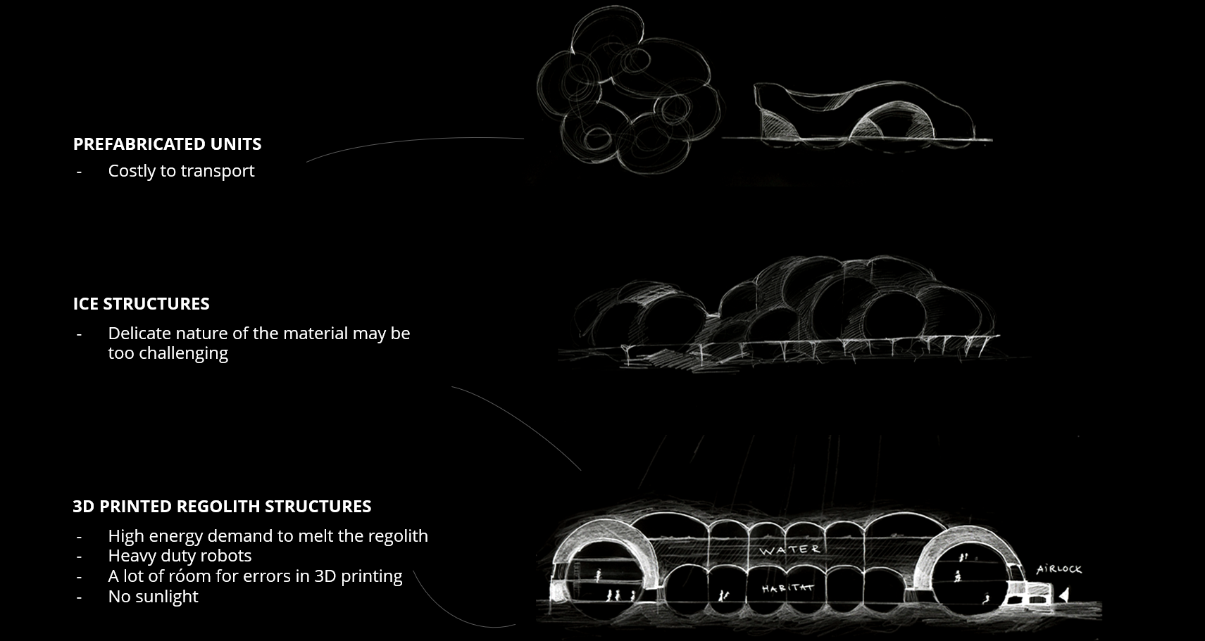 Taking these drawbacks into consideration I started looking more into different types of inflatable structures. They are easy to install, strong and lightweight, so the cost of the transportation will not be as drastic. I thought that Martian water could be used to inflate the units, as it is also great for radiation protection, being high in hydrogen.
