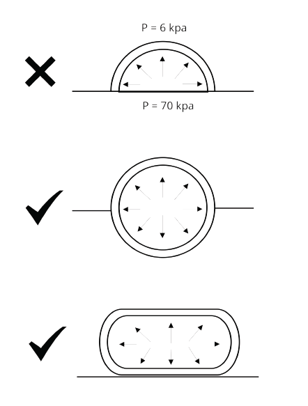 So the artificial atmosphere that is suitable for humans should be created inside of the habitat. It will be pressurized, and to balance this internal pressure all the shapes should be smooth. But the internal forces push against all surfaces, not only walls, so structures with flat bottoms are just going to shoot upwards. That is why domes should not have flat bottoms, but be round altogether. They can also be fused together.