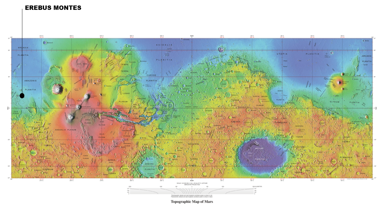 Because, the water is needed for construction method to supply the mycelium growth, it is needed to choose a landing site which has it. Traditionally the landing sites for rovers are chosen to be in the equator, but for the colony I decided to choose Erebus Montes as a landing site. In this location the ice water is right below the surface. The location has flat surface on lower elevation, which means higher pressure and easier landing.