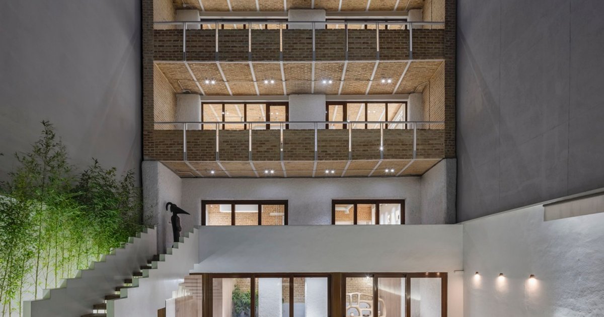 Naeem Café revitalizes a historic Tehran building, blending restored brick, sculptural staircases, water features, and flexible cultural spaces for modern life.